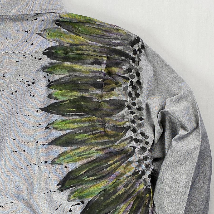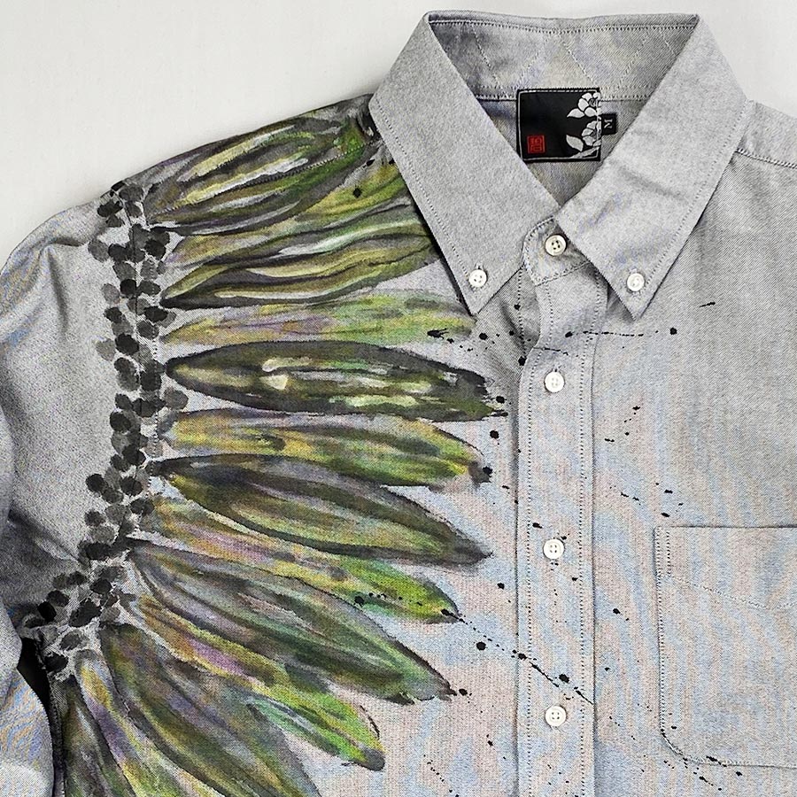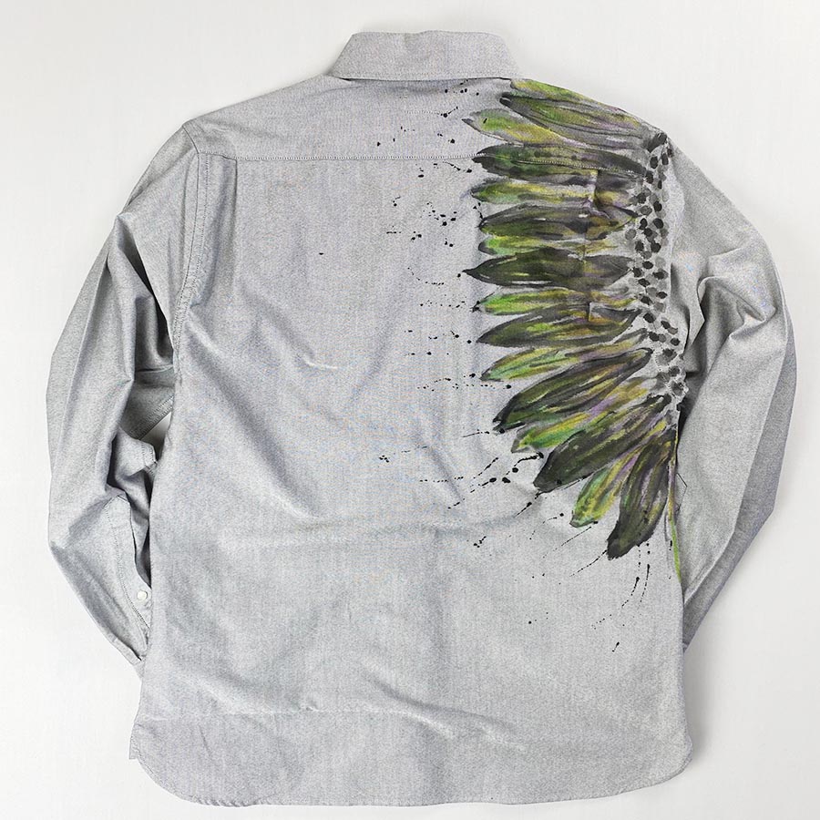ガーベラの花言葉は、感謝・希望・前進などポジティブな意味合いが多いので、よくプレゼントにされるお花ですね。そんなガーベラの花を有り得ない大胆な位置に手描きした個性的なシャツ。片方の腕の付け根にぐるりと描いたガーベラはとても存在感があります。