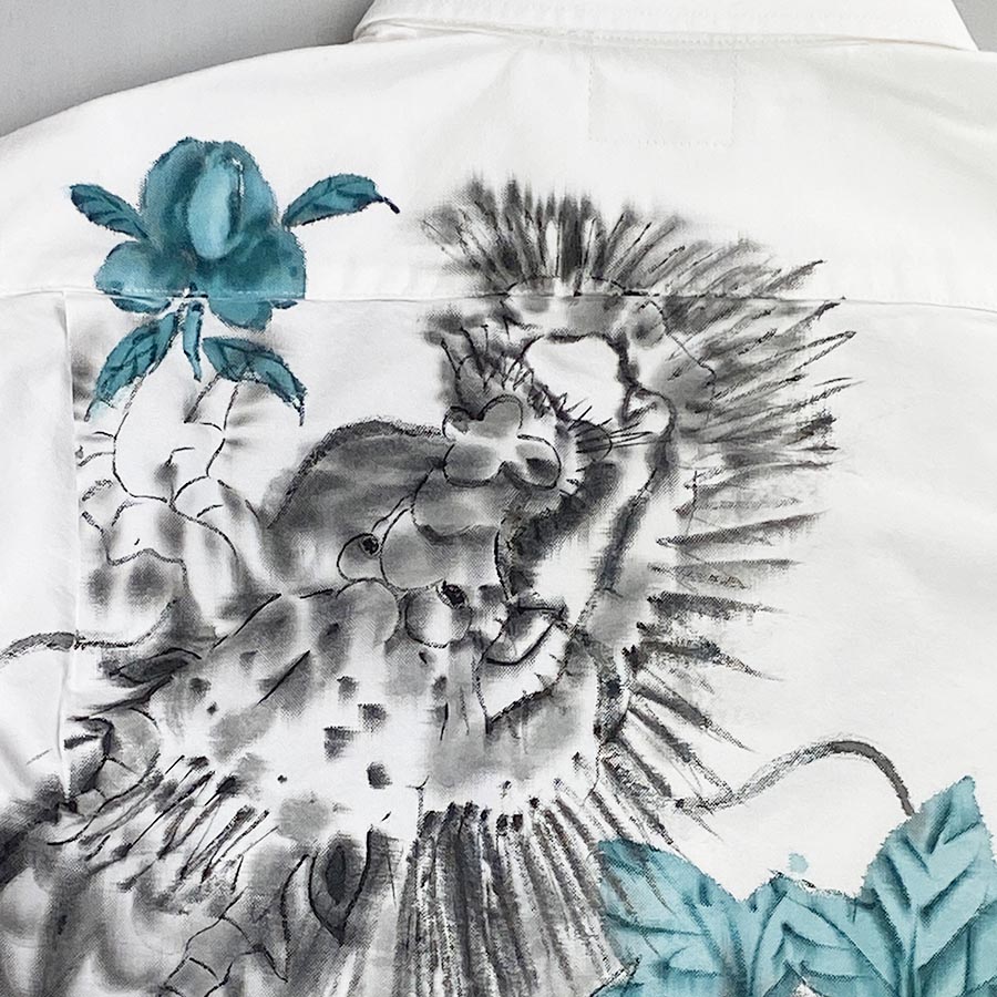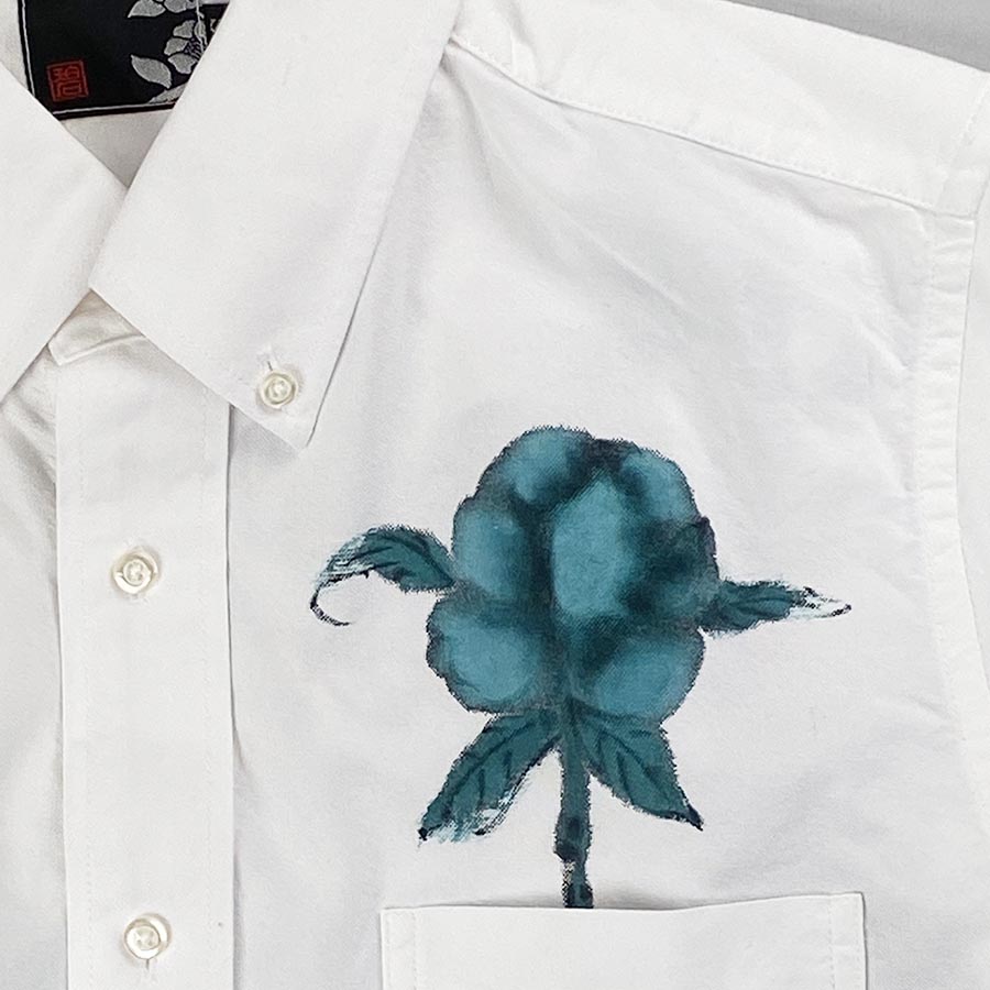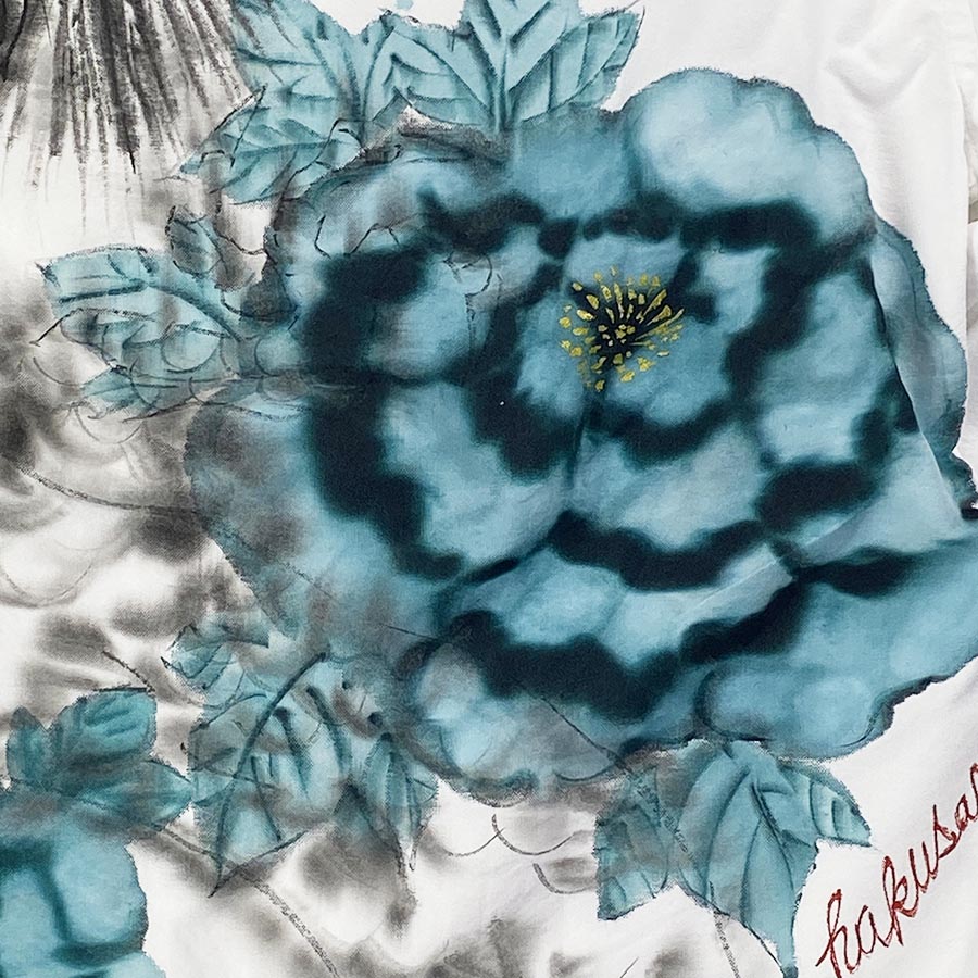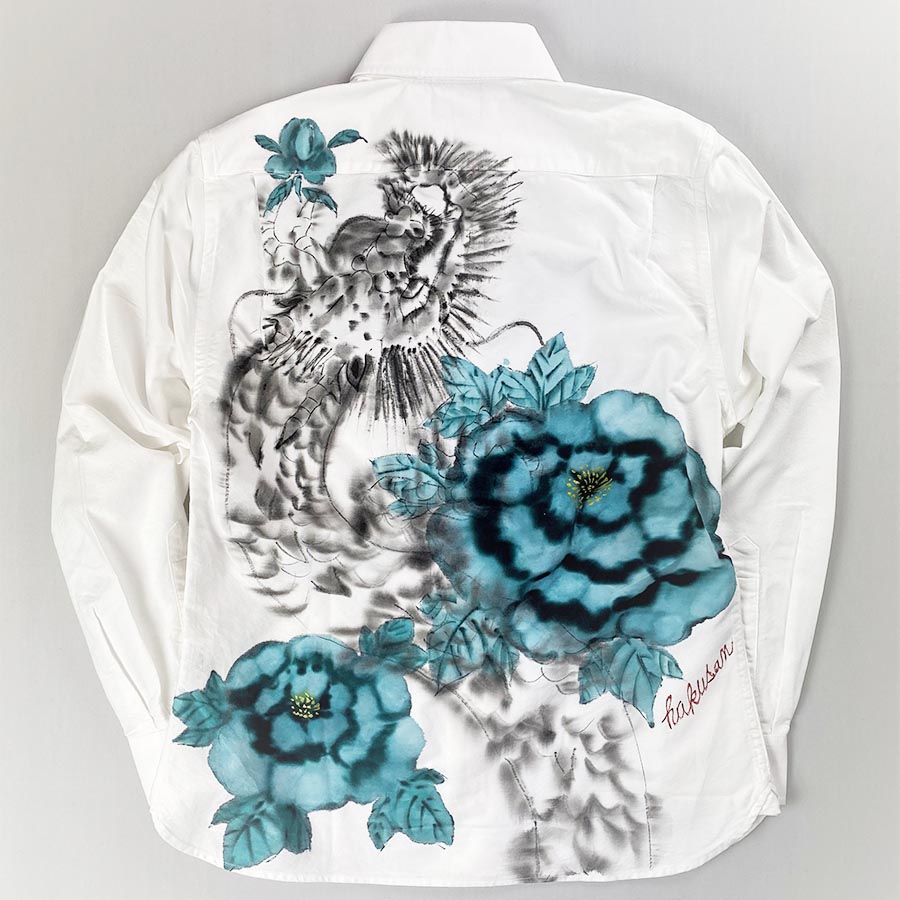 青銅色の渋く瑞々しい牡丹の花。その花を潜り抜ける様に龍が泳ぎます。墨濃淡の龍は背中に大胆に。滲んだ龍の線はとても味があります。胸ポケットの牡丹の蕾が素敵♪