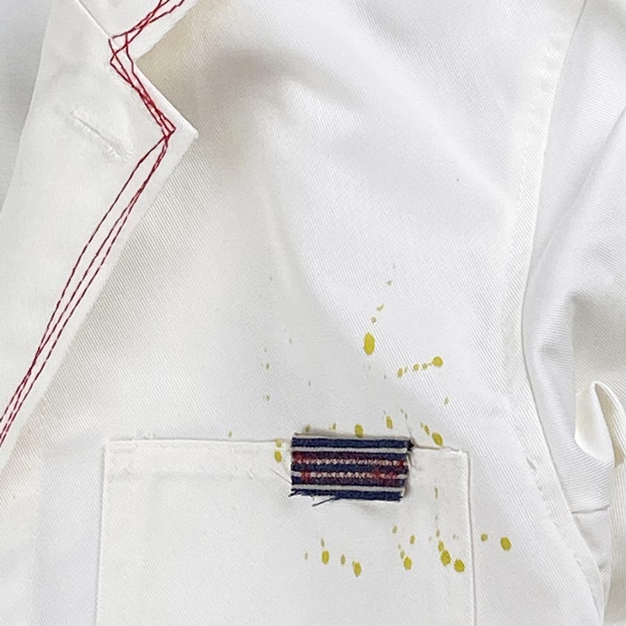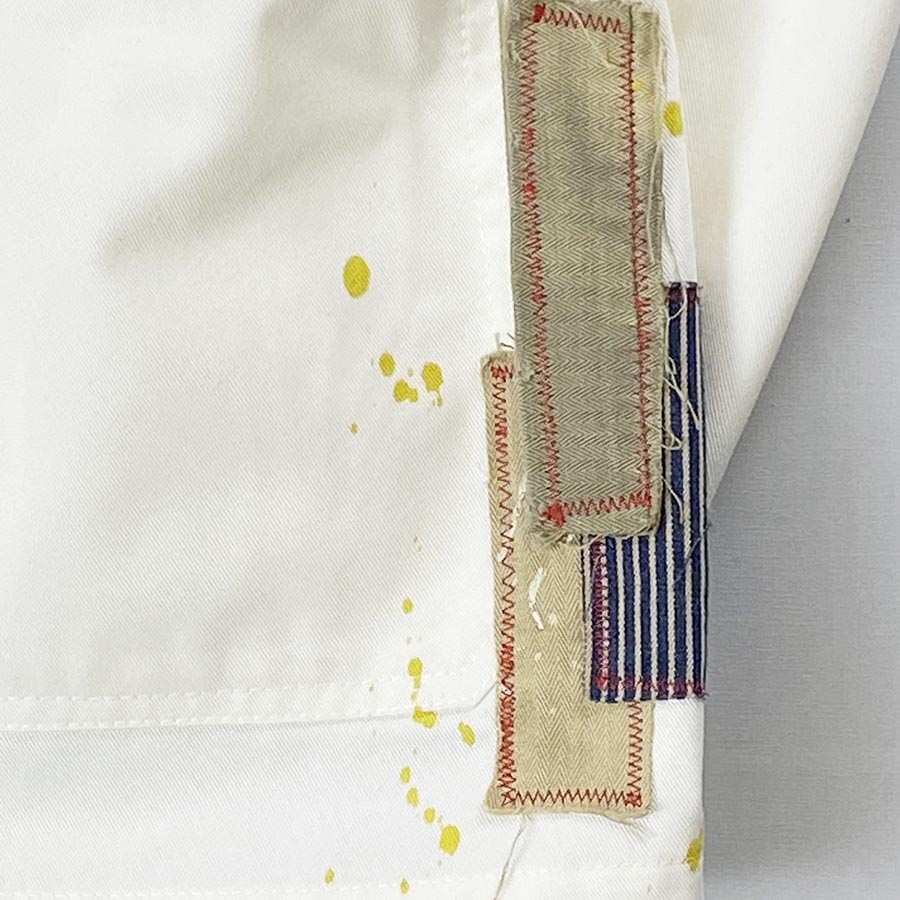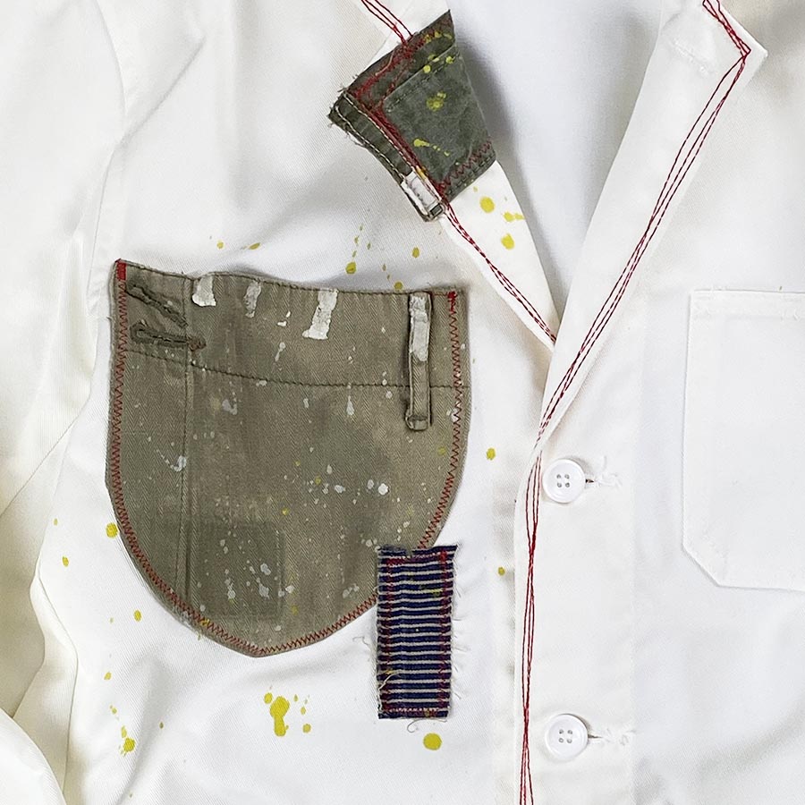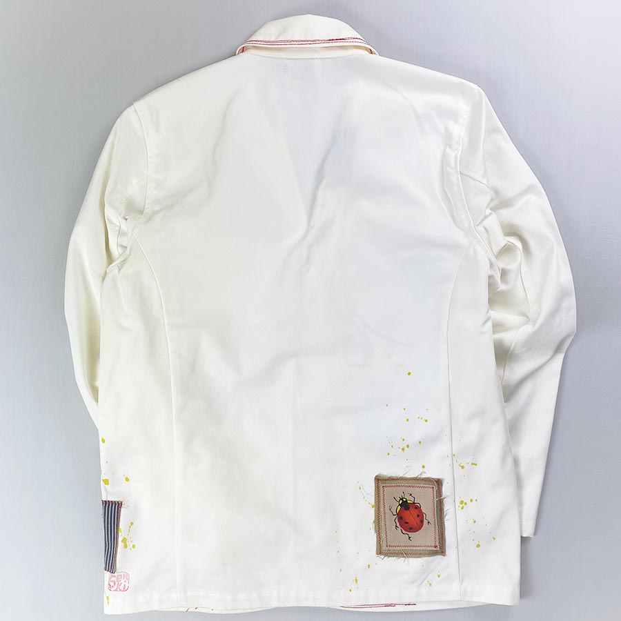 衿、ポケット、裾…様々な生地を使い、ステッチを織り交ぜてリメイクしました。弊社「ゲンセンス」でお馴染みのポップでキュートなリメイクです。後のてんとう虫がワンポイント!カチッとシンプルなジャケットがリメイクによって味が出ました!