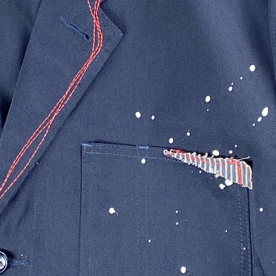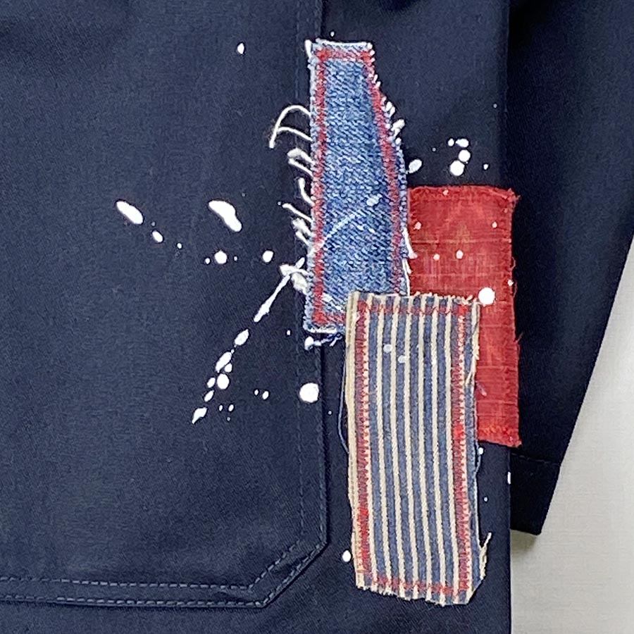 衿、ポケット、裾…様々な生地を使い、ステッチを織り交ぜてリメイクしました。弊社「ゲンセンス」でお馴染みのポップでキュートなリメイクです。後のてんとう虫がワンポイント!カチッとシンプルなジャケットがリメイクによって味が出ました!
