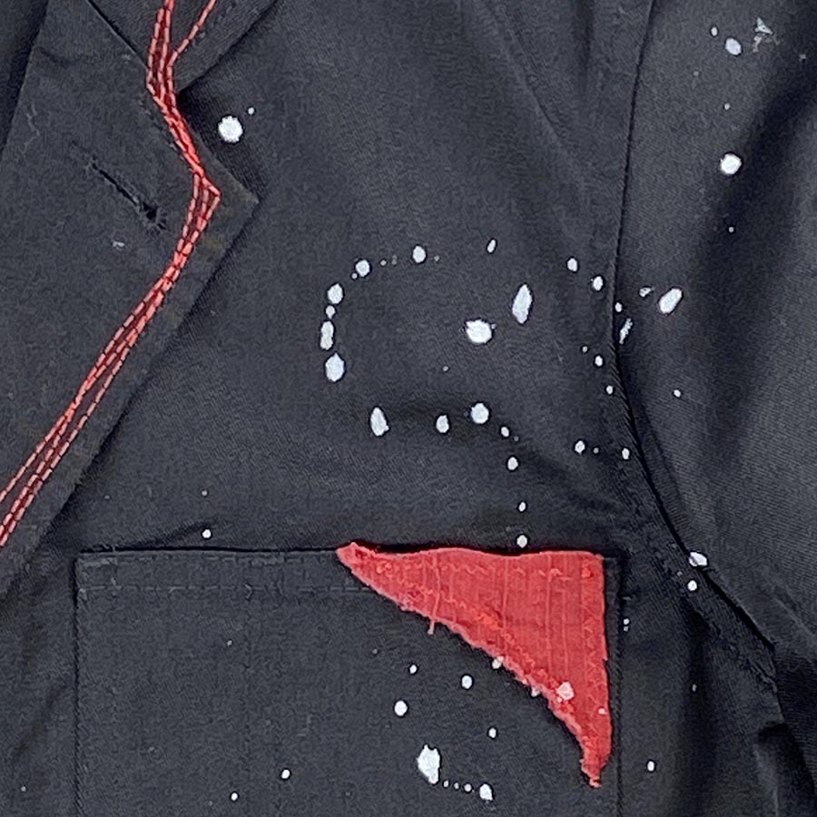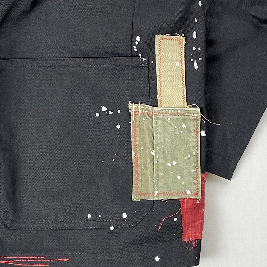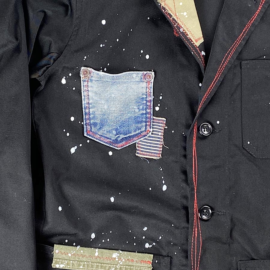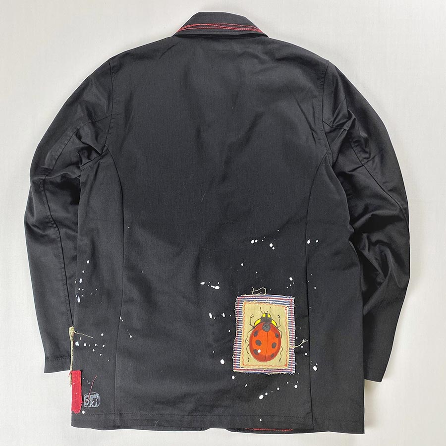 衿、ポケット、裾…様々な生地を使い、ステッチを織り交ぜてリメイクしました。弊社「ゲンセンス」でお馴染みのポップでキュートなリメイクです。後のてんとう虫がワンポイント!カチッとシンプルなジャケットがリメイクによって味が出ました!