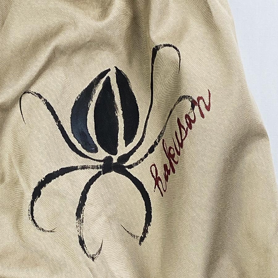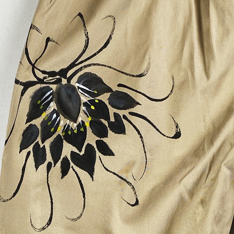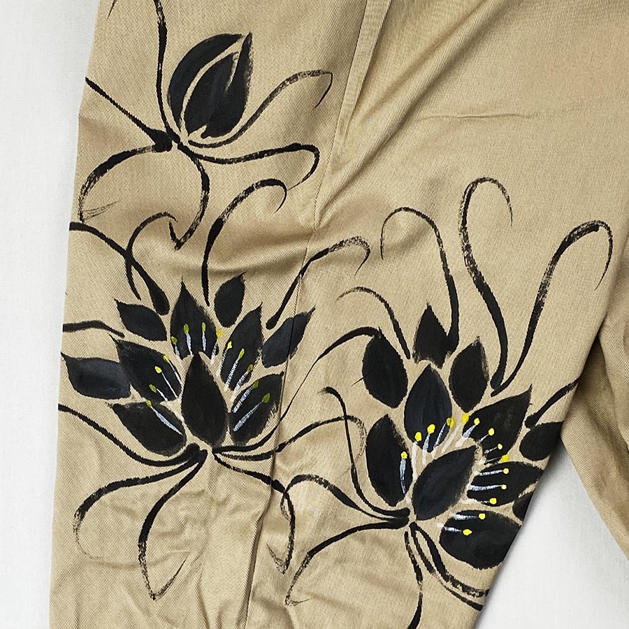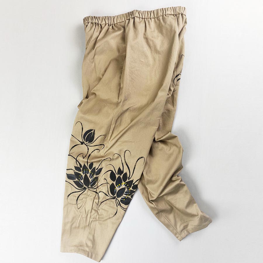 そのパンツに碧の定番柄、月下美人を描きました。ある日の夜に華やかに真っ白に咲いて、一瞬のうちにしぼんでしまう儚い花。ベージュ色の地に、墨濃淡で花の姿通りに華やかに仕上げました。