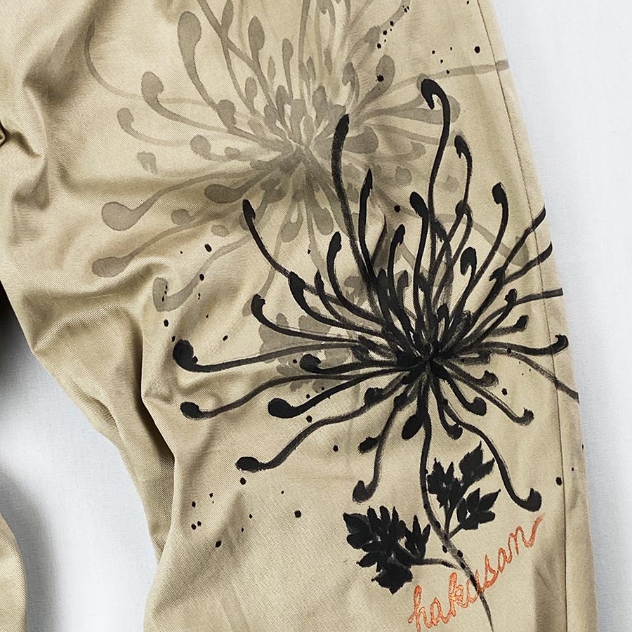 そのパンツに碧の人気柄、乱菊を描きました。花言葉は「高貴」。粋な日本らしい形の花です。