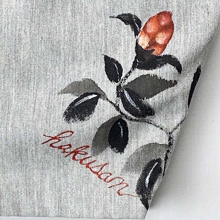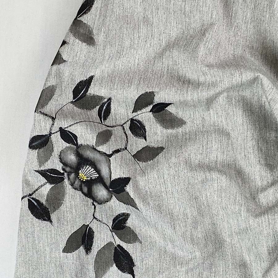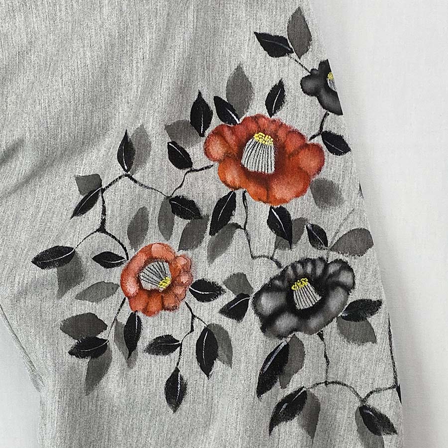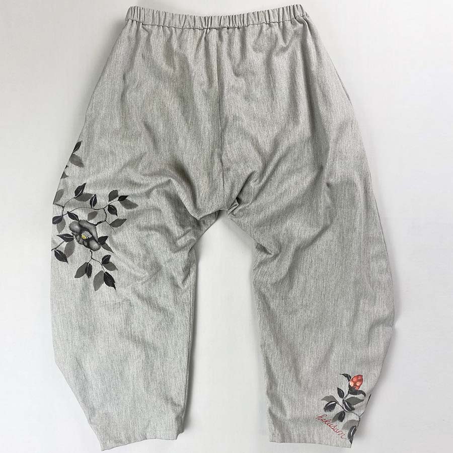 その烏賊パンツに朱赤の椿と墨濃淡の椿と2色で描きました。