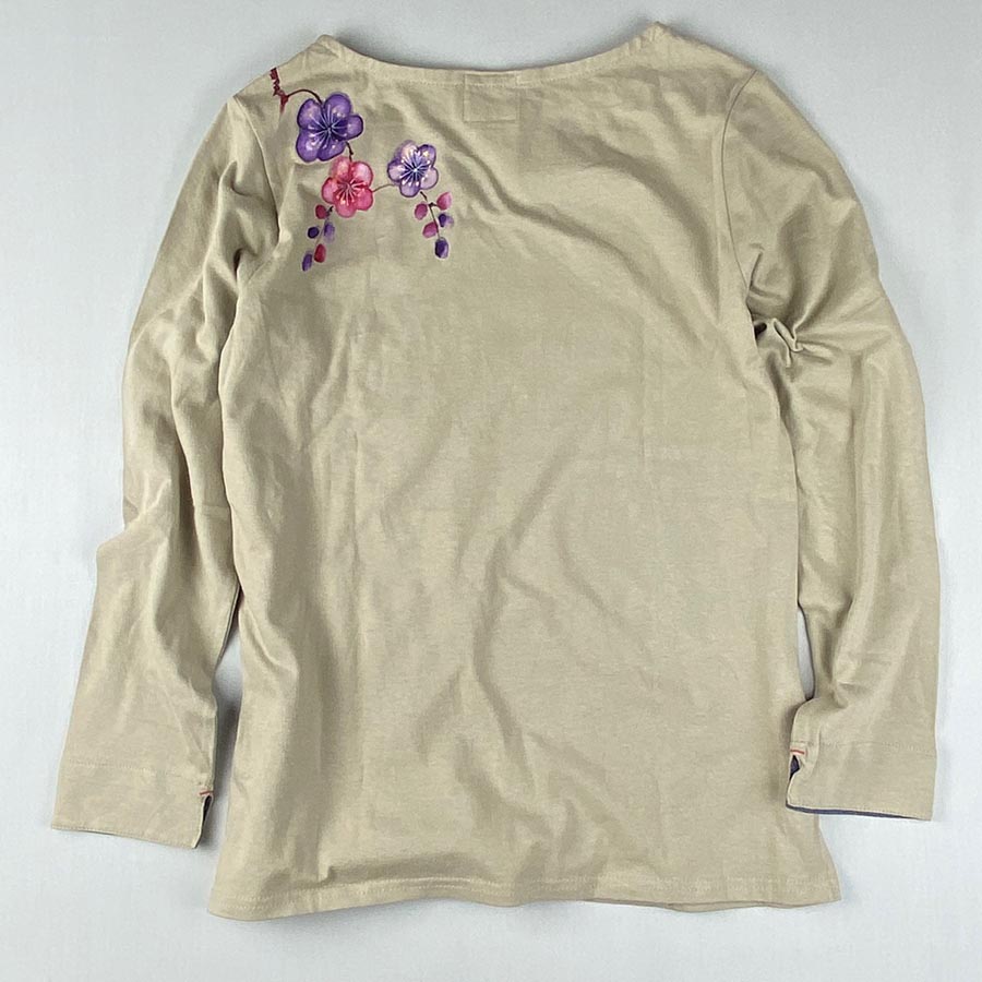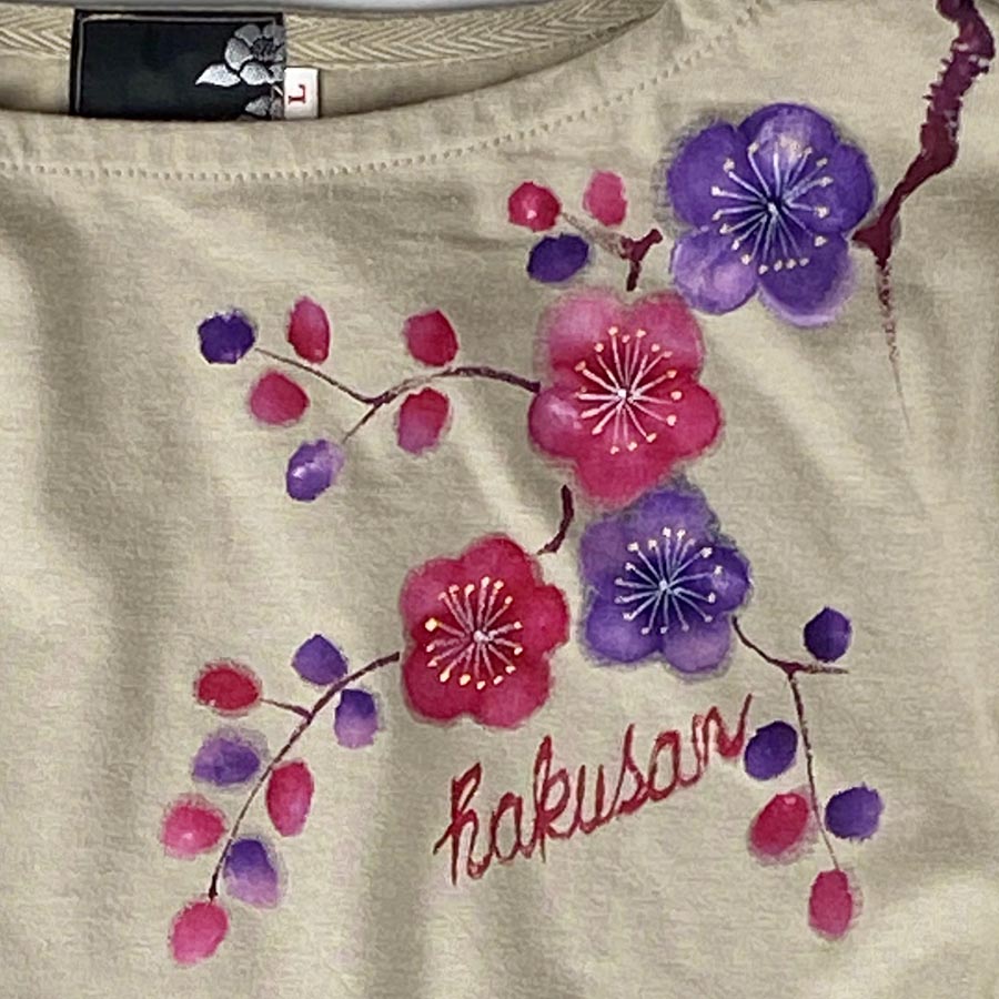 その長袖Tシャツに桃色と紫色の梅を描きました。