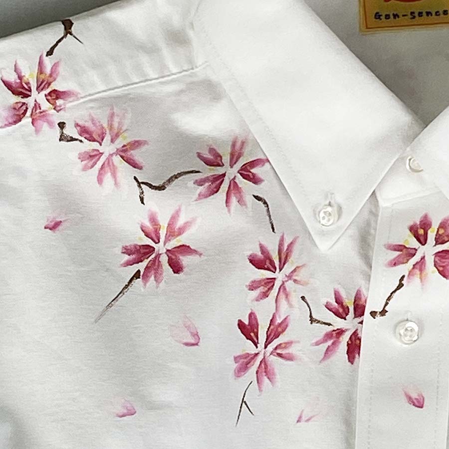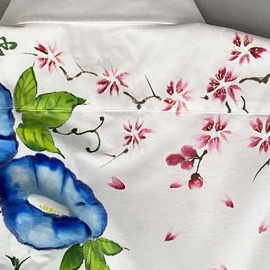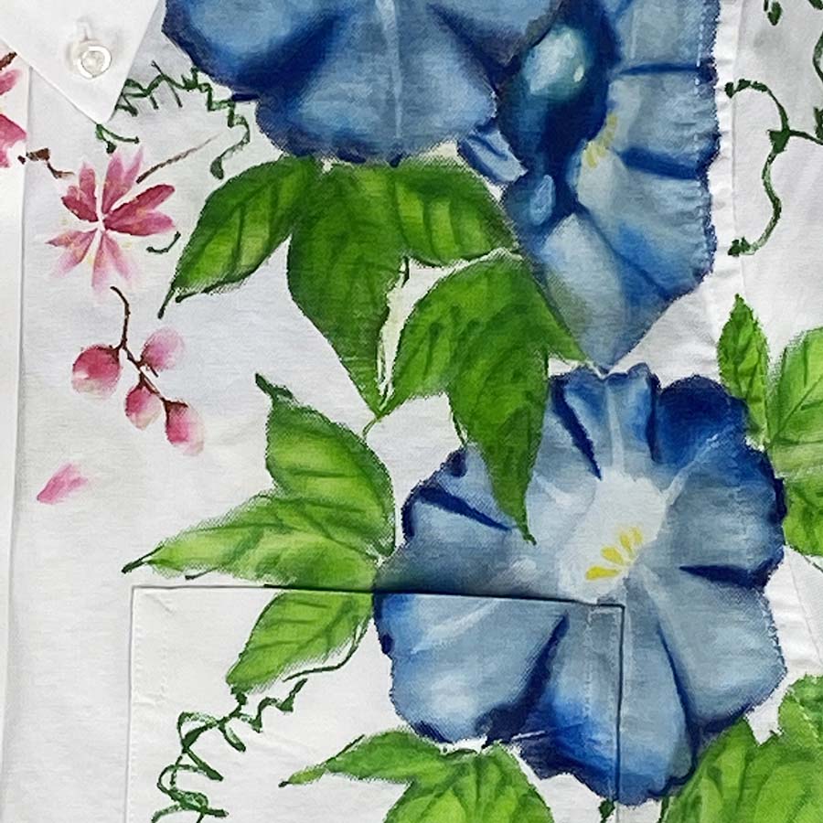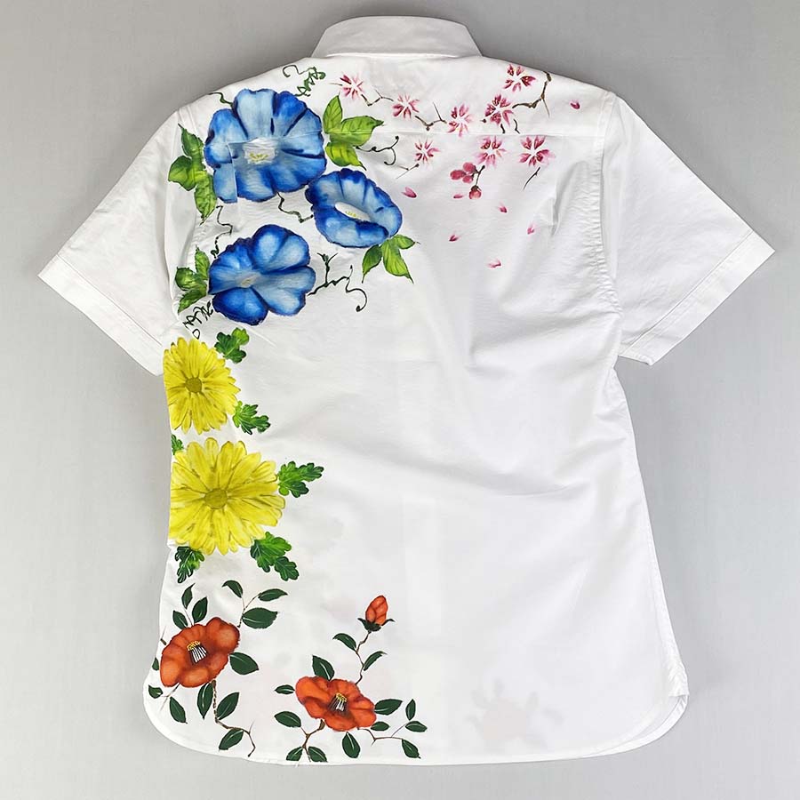 シンプルなボタンダウンのシャツに、桜・朝顔・菊・椿と日本の四季の花々が白いシャツを彩ります。
