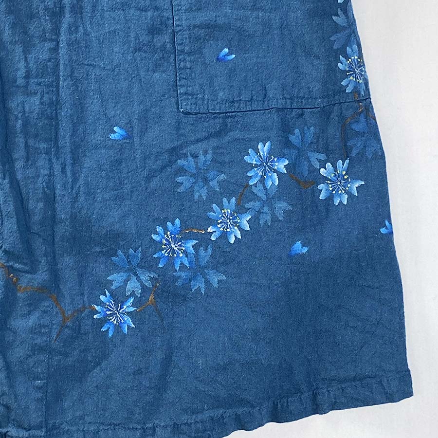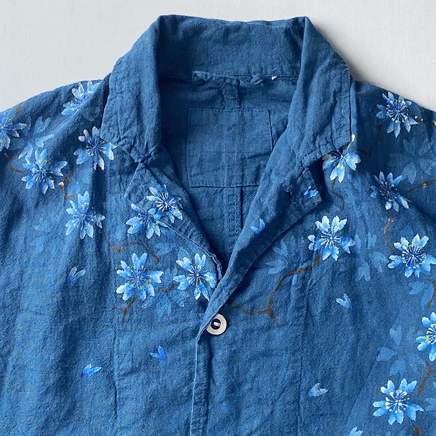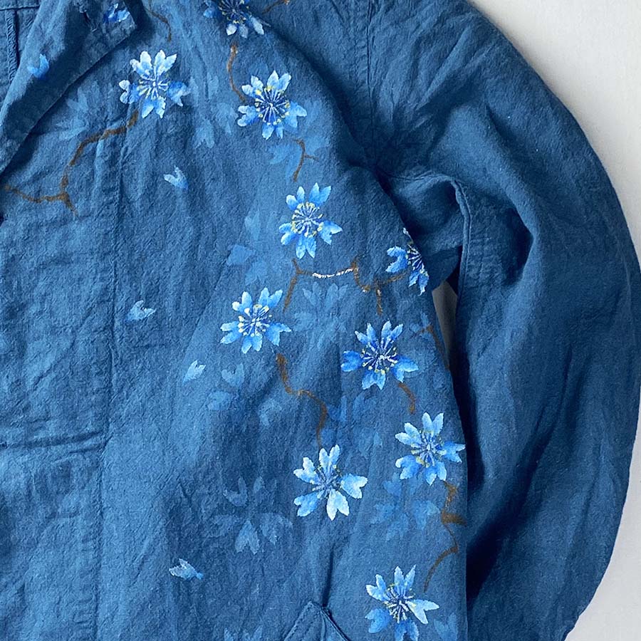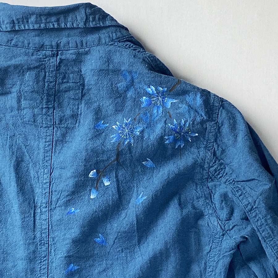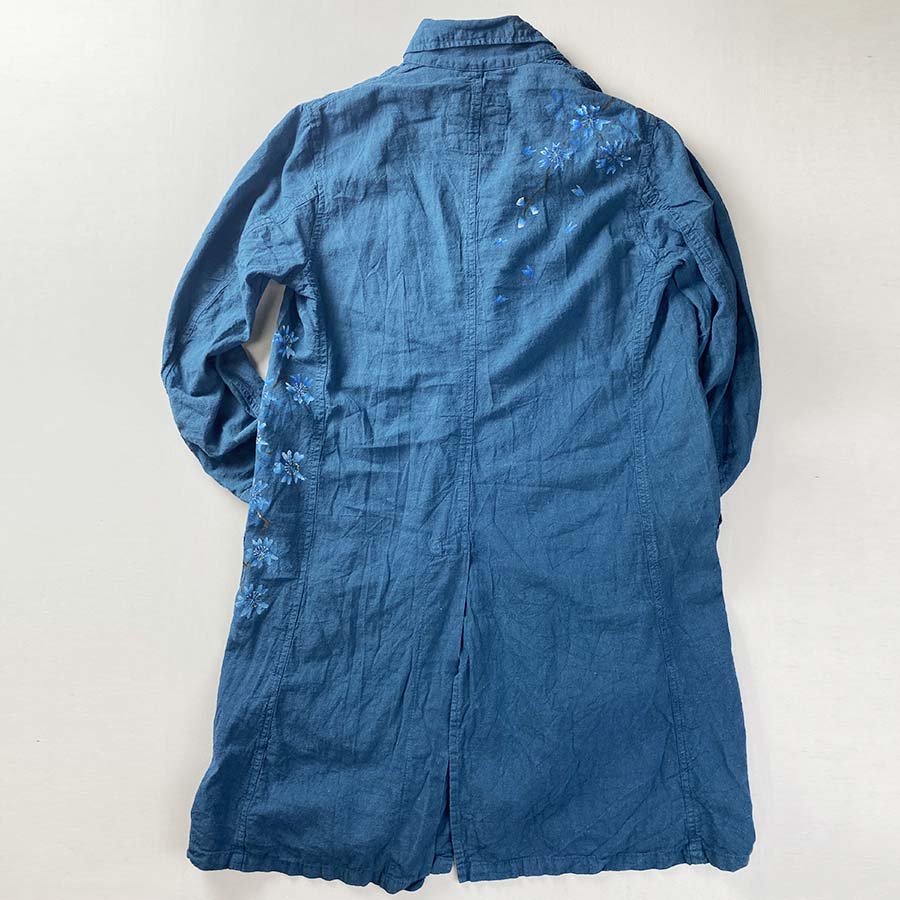 コートの地色と同系色で仕上げた青い桜はとても粋で美しい。