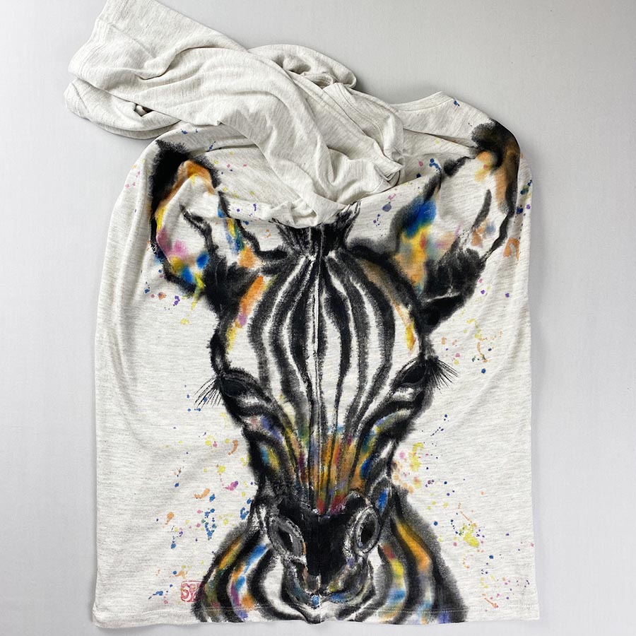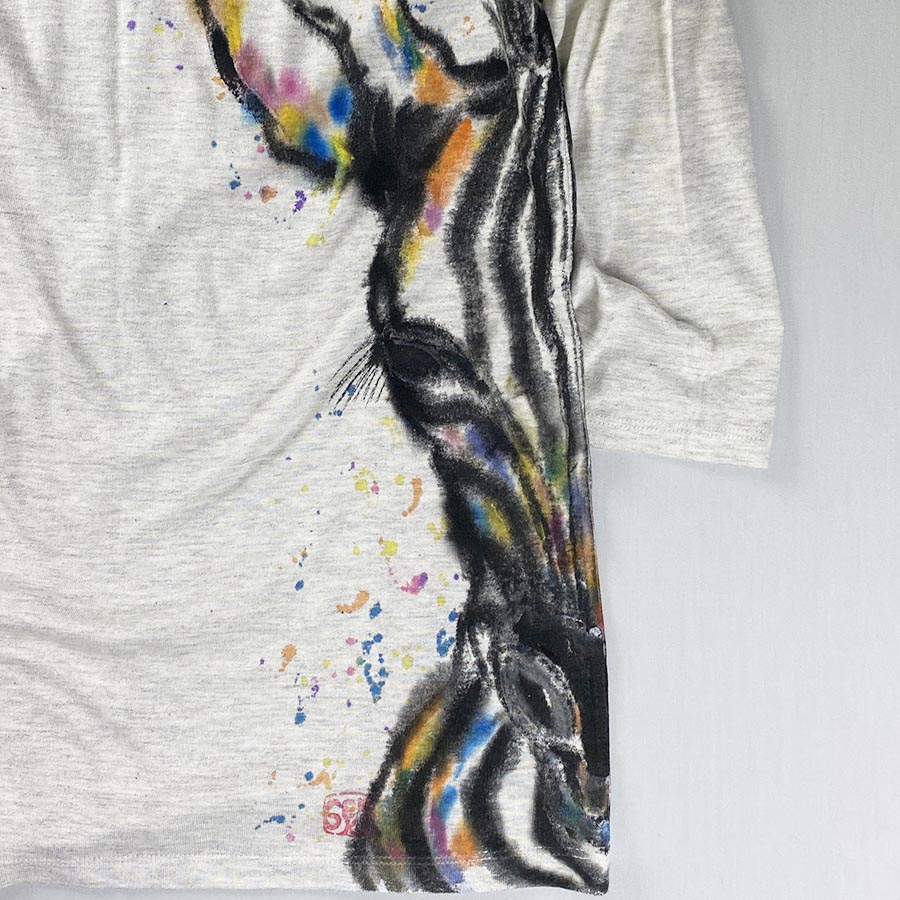 ふわふわの凄く肌触りの良い七分袖。気持が良いのでおススメです!その素材に可愛らしい縞馬(しまうま)の顔を描きました。