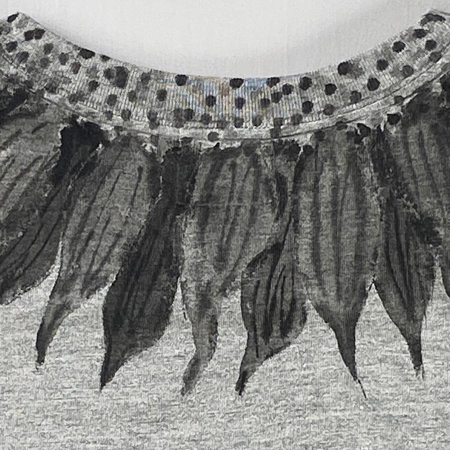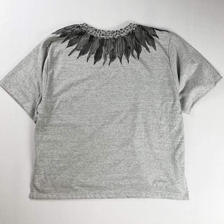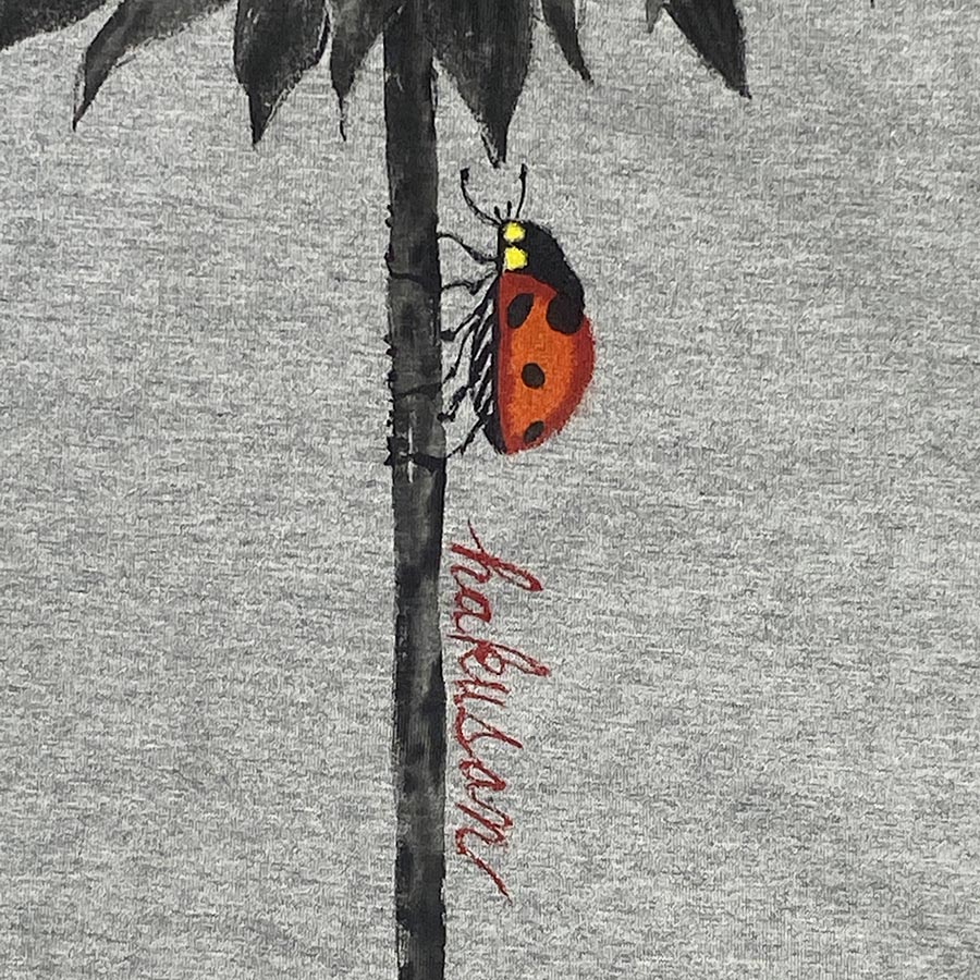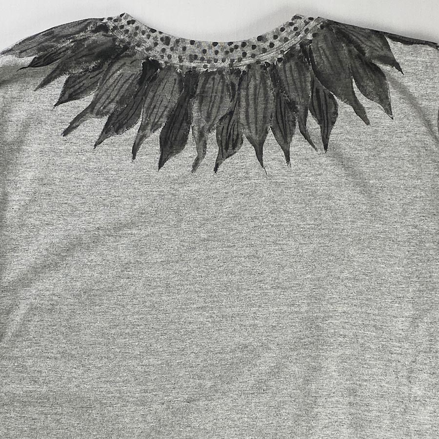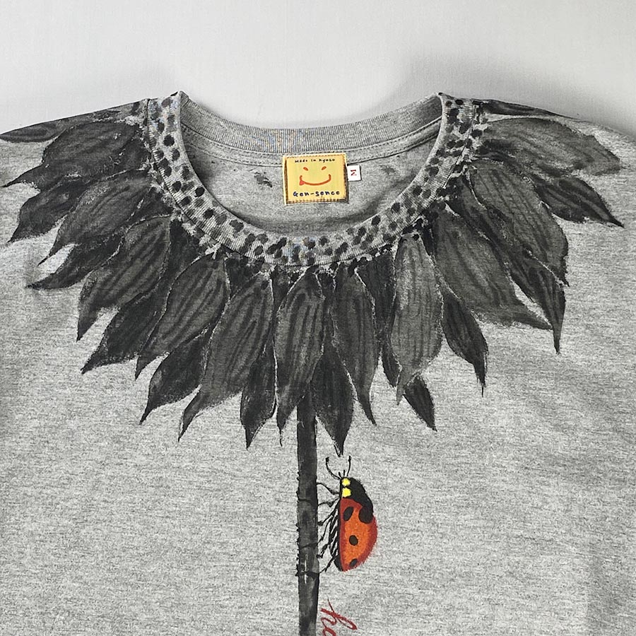 そのTシャツの首回りには向日葵が墨濃淡で表現されています。着た人の「顔」が花の芯の部分になります。
