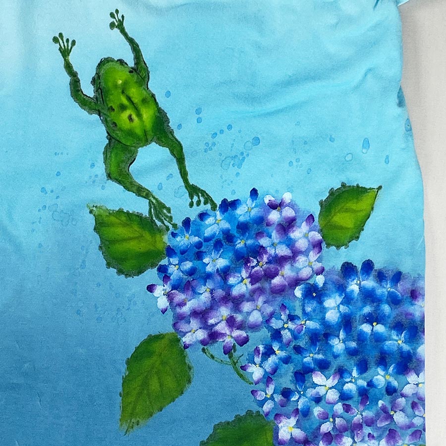 愛らしいアマガエルが勢いよくジャンプしている様を一枚のTシャツに表現しました。