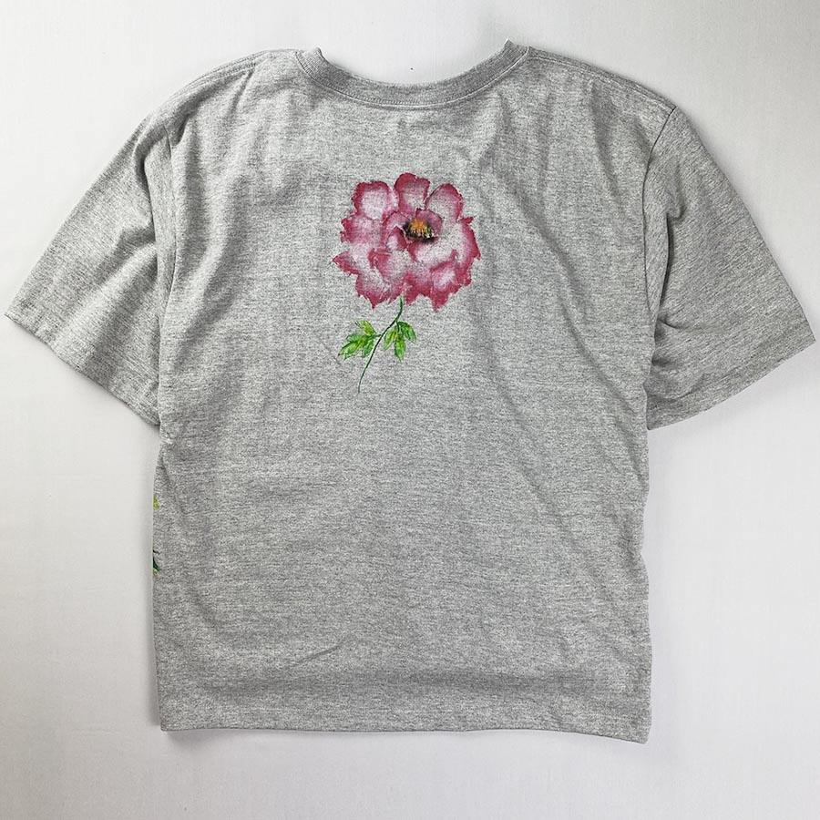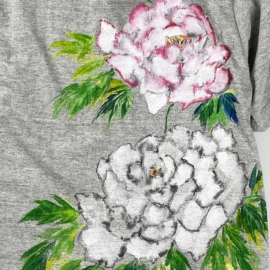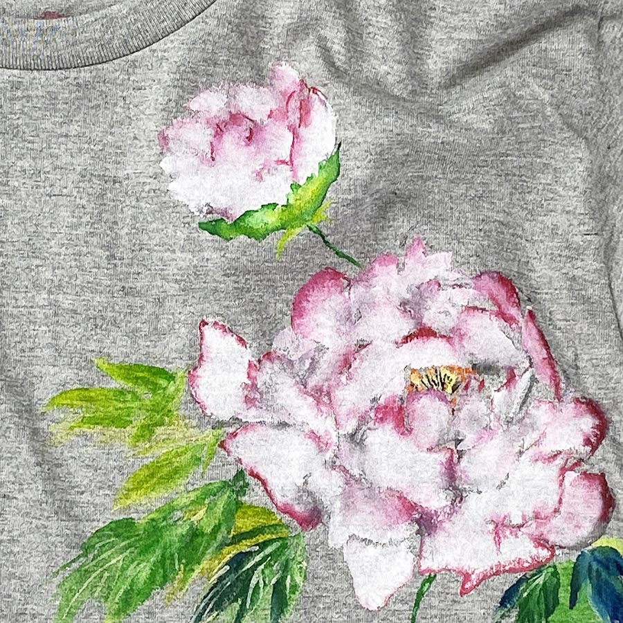 ゆったりしていて袖丈も長めのとても着やすいTシャツに「花の王様」と言われるボリュームたっぷりのあでやかな花姿の牡丹。ピンクとホワイトで表現しました。気品の風格は花世界でトップですね。
