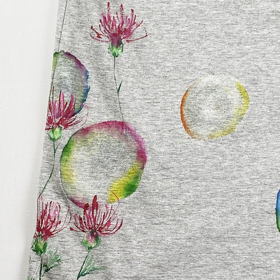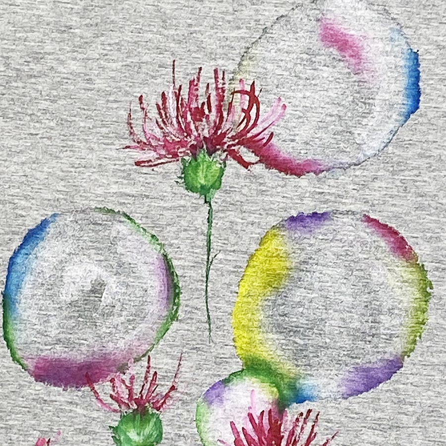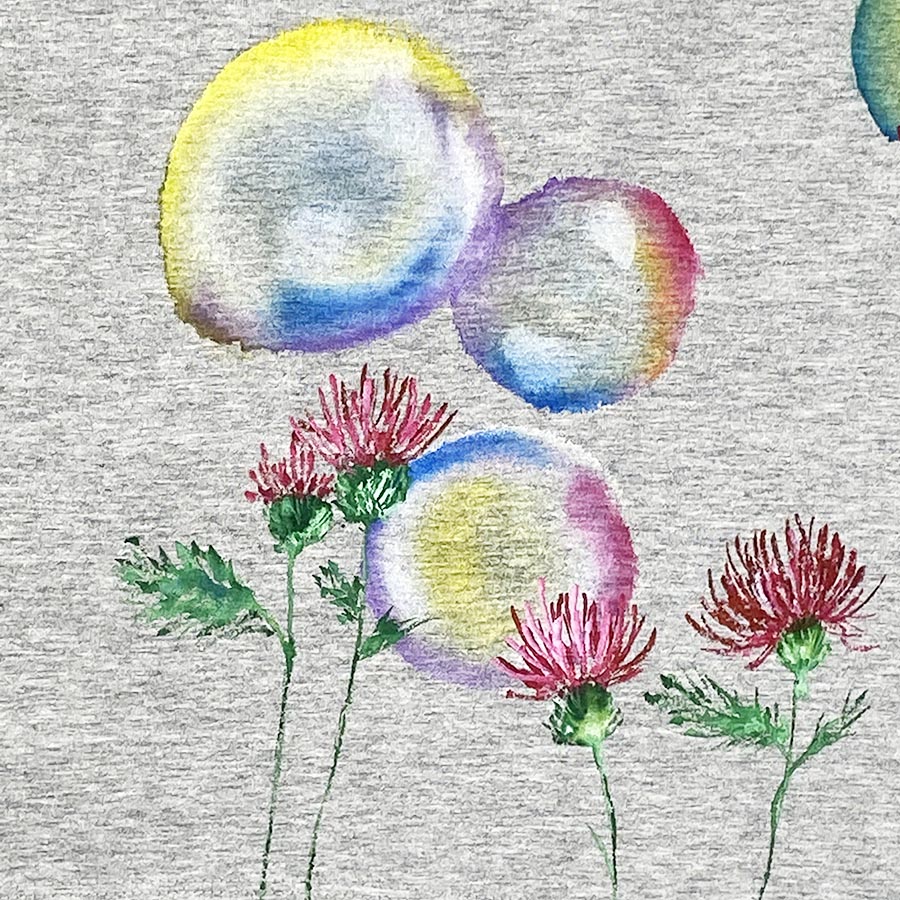 ドルマン仕様のワンピースに薊(あざみ)の花を描きました。明るい花色で可愛らしい姿なのにトゲが特徴的で対照的な面を併せ持つ面白い花です。風に揺れてふわふわとシャボン玉の様に揺れる薊をお楽しみください。