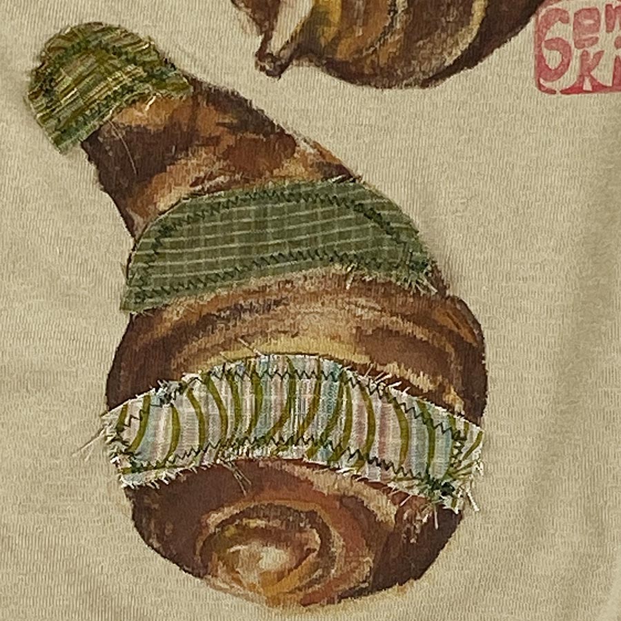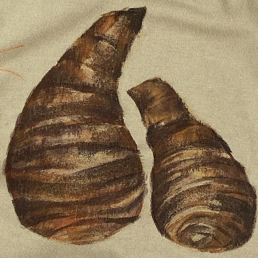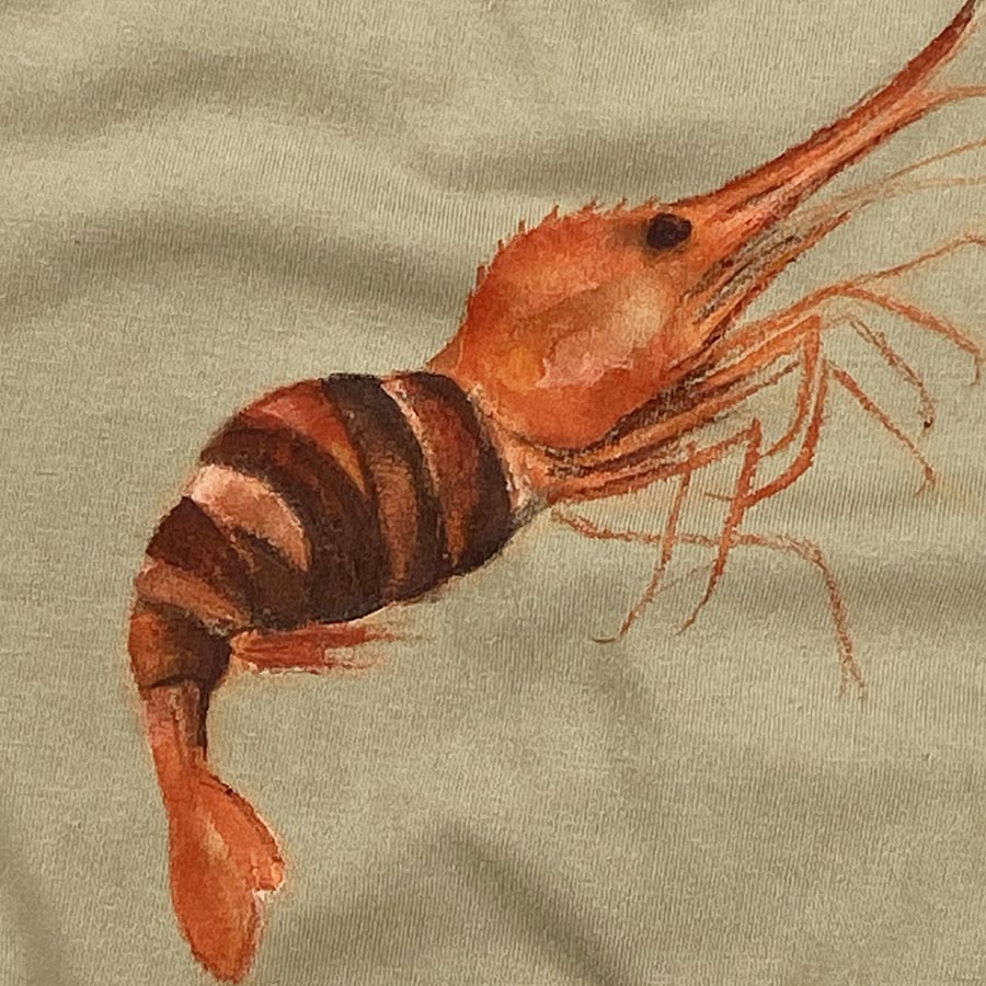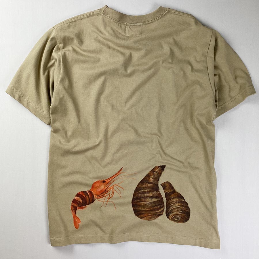 京野菜の海老芋(えびいも)は反り返った形と表面の縞模様がエビのように見えるのでそう呼ばれるようになりました。隣にボタンエビも描いて楽しいTシャツに仕上げました。