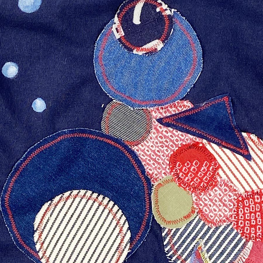 沢山の様々な生地をリメイクして造形されたこの生き物、出目金を表現したリメイクなんです!あわぶくをふいて楽しそうに泳ぐ出目金ちゃん。ひょうきんな表情、とても可愛くないですか?