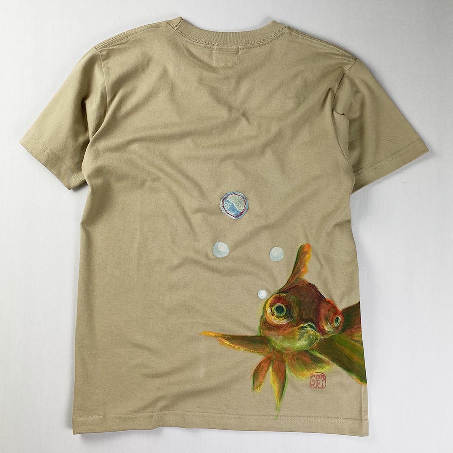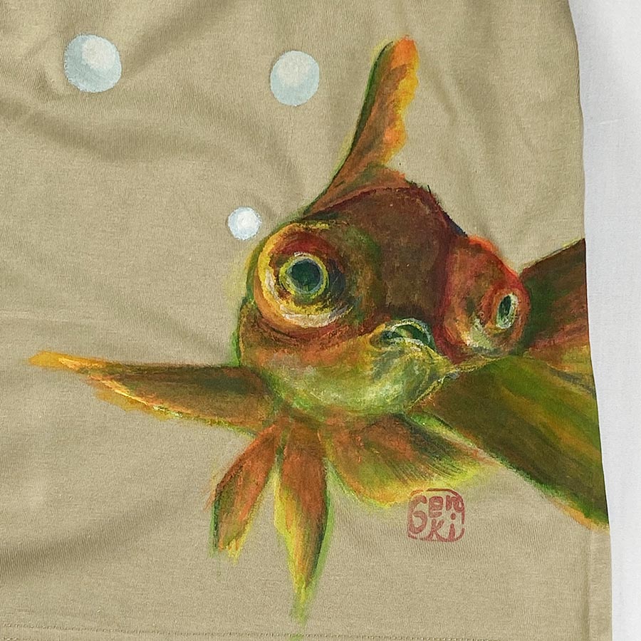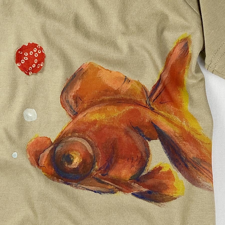キョトンとした顔、とぼけた顔が愛らしい金魚です。不思議な色合いの出目金達は水の神が住む竜宮で泳ぐ金魚達です。そんなおとぎ話をTシャツに表現しました。