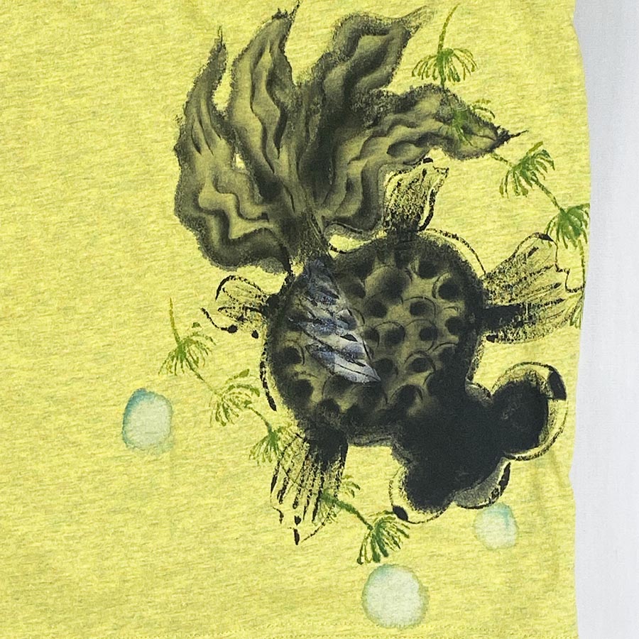 そのTシャツに黒出目金を描きました。目は丸くて大きい可愛らしく、丸みを帯びた体型で頭を振りながらスローペースで泳ぐ姿は見ているだけで癒しを与えてくれます。そんな黒出目金をTシャツに泳がせました。