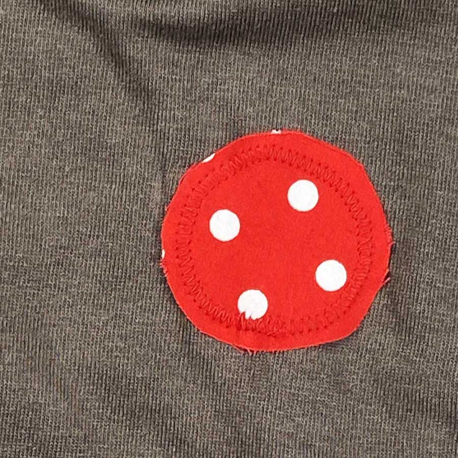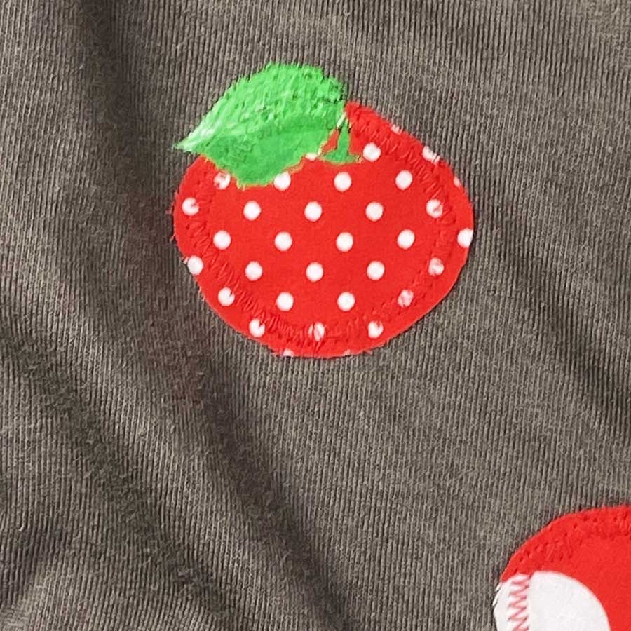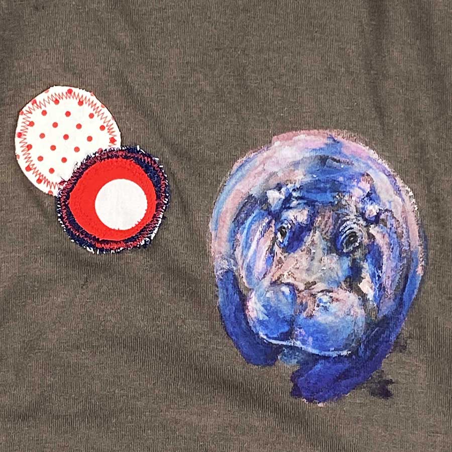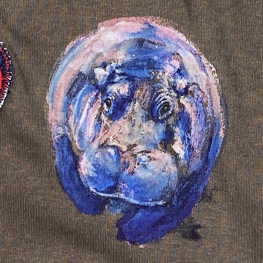後ろ身頃には、ボールのようにまんまるの愛らしい子供カバが、水玉めがけて走っています。