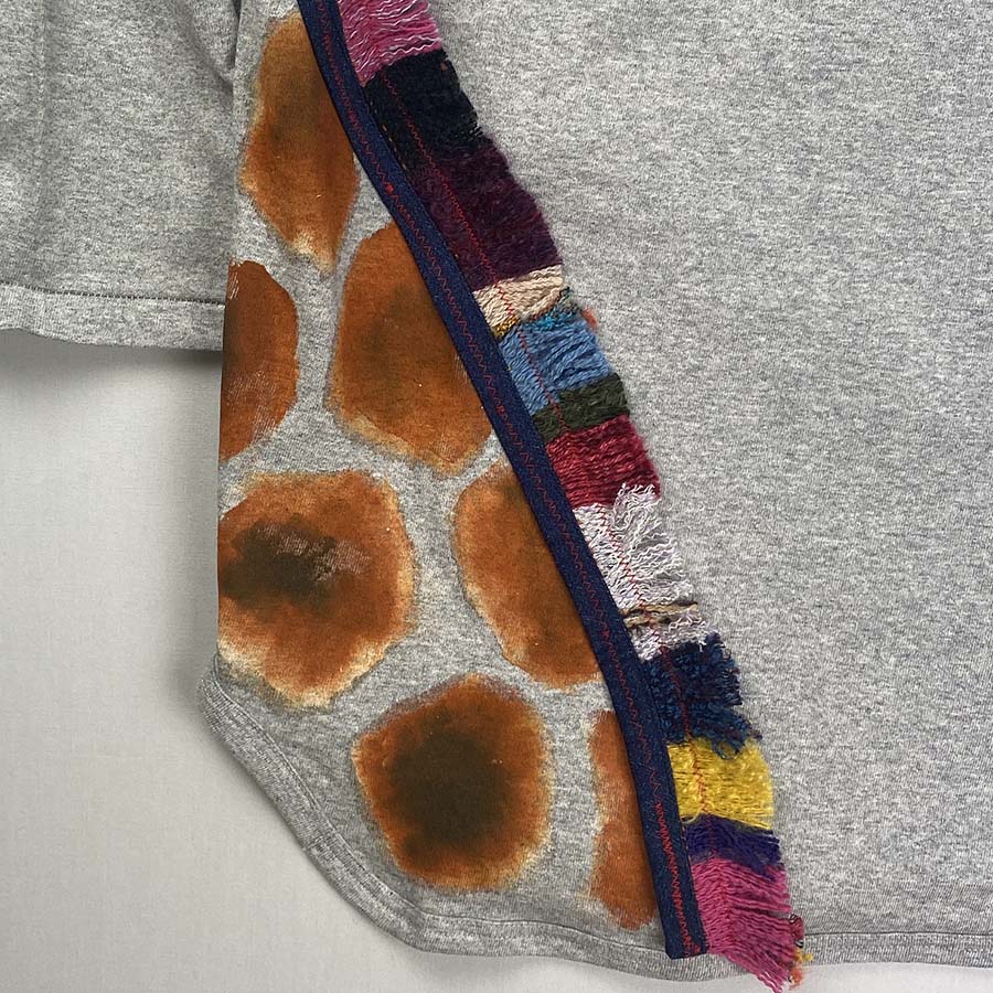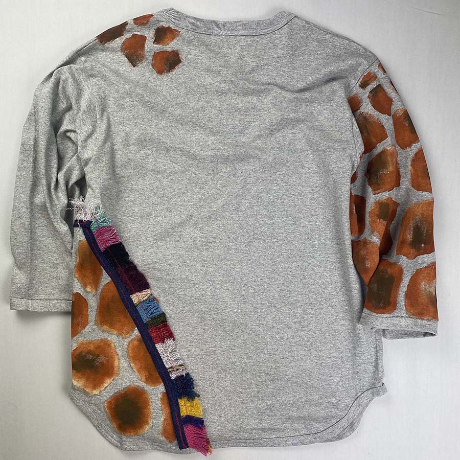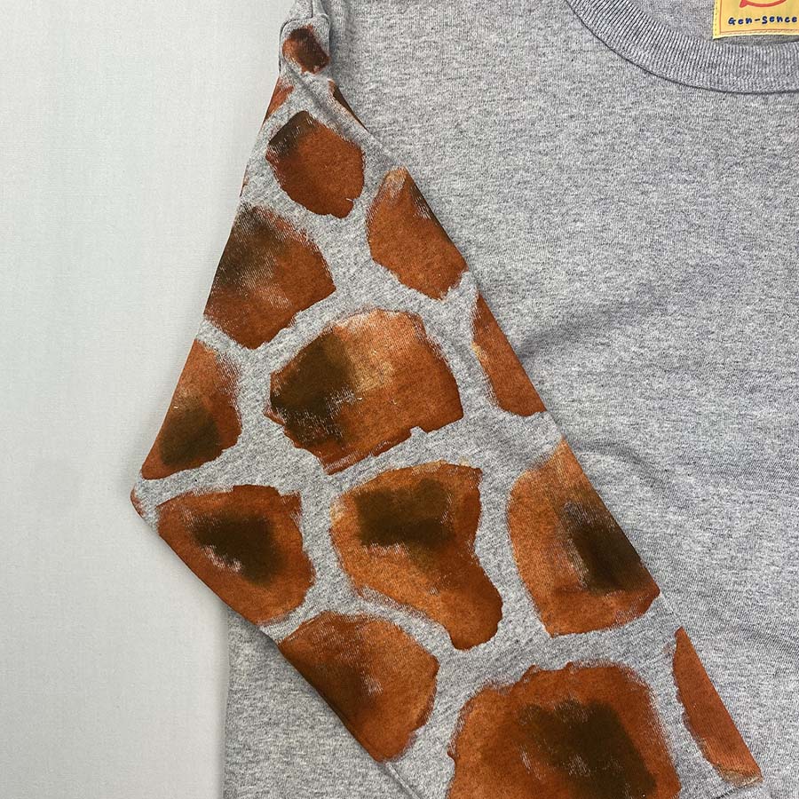 カジュアルな雰囲気のベースボールTシャツ。裾はラウンドしたバインダー仕上げでビンテージ感があります。そのTシャツにキリンのジラフ柄を描きました。