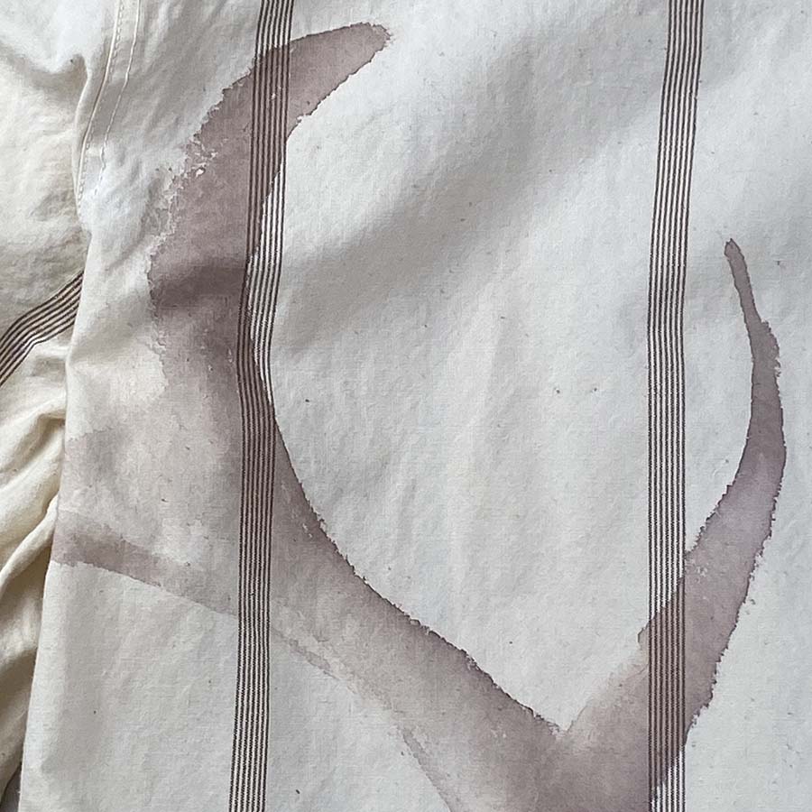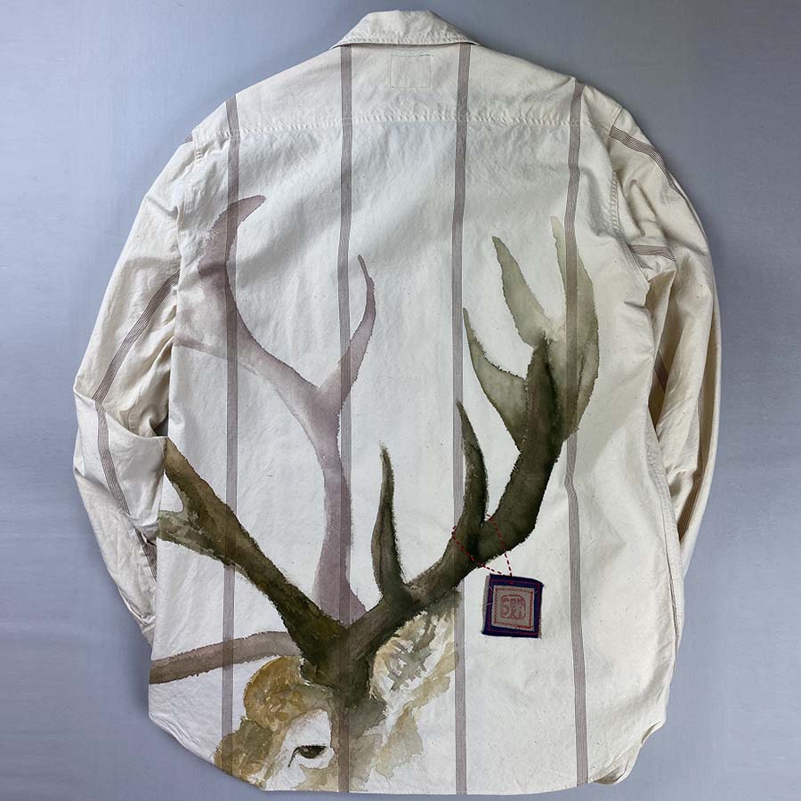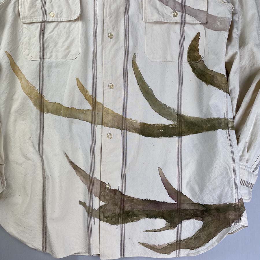 コットンシャツに茶色いストライプの入ったカジュアルなワークシャツ。