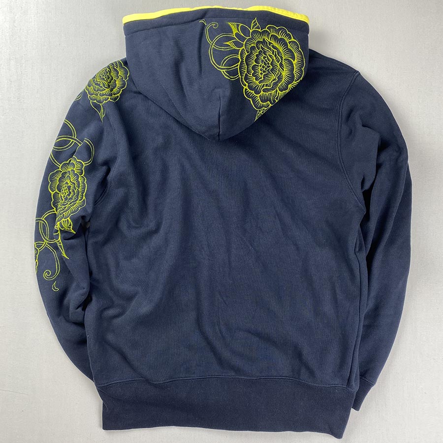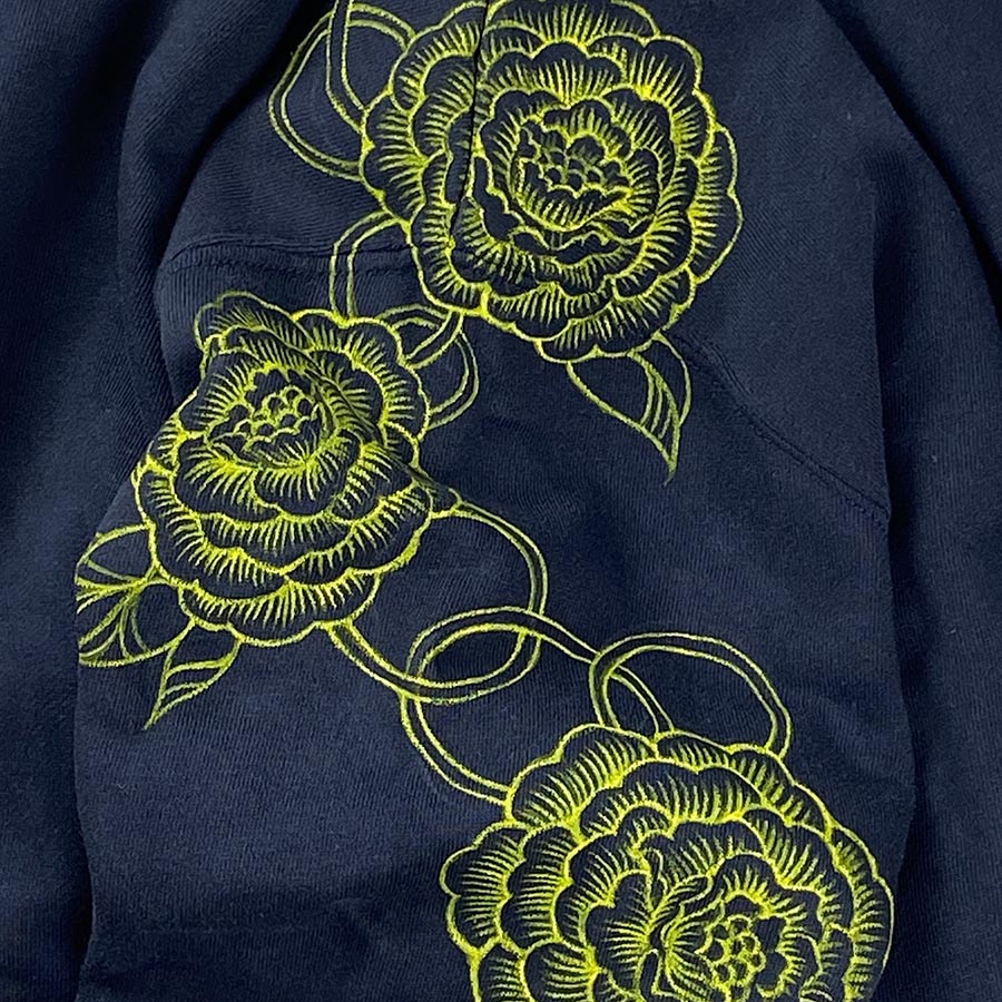 機械でのプリントの様に見えるこのとても細かな柄も全て職人が手描きで線描きした作品です。手描きならではの柄の位置にこだわり、フードから袖にかけて牡丹を抽象的に描いています。フード部分が二重で内側は黄色の生地が使われています。