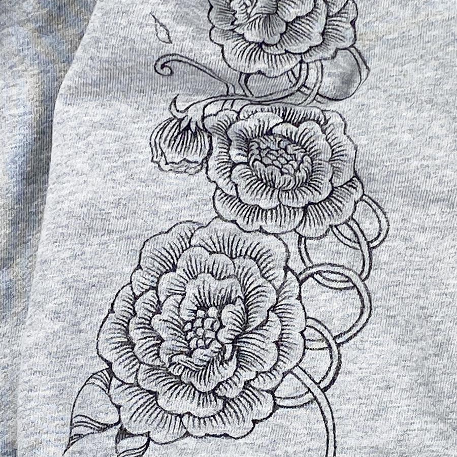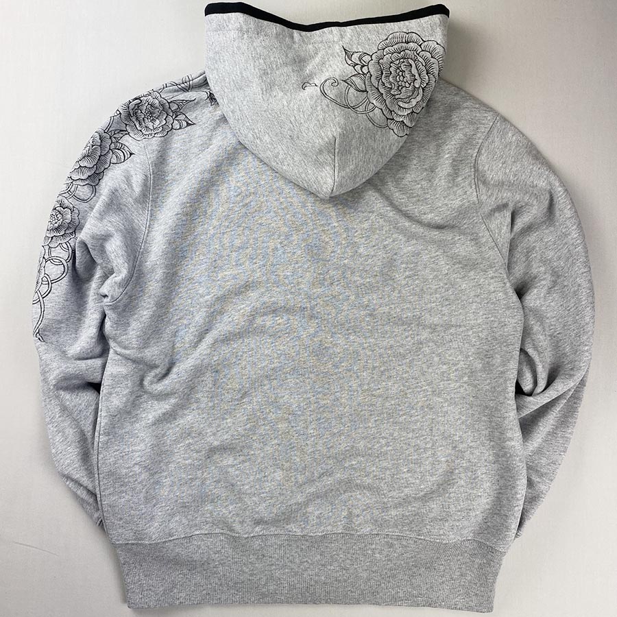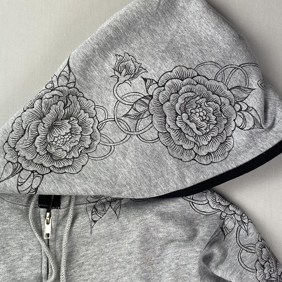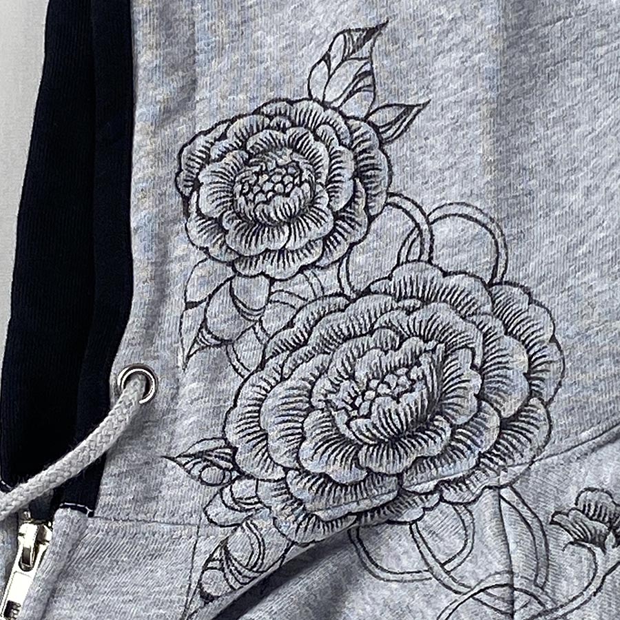 機械でのプリントの様に見えるこのとても細かな柄も全て職人が手描きで線描きした作品です。手描きならではの柄の位置にこだわり、フードから袖にかけて牡丹を抽象的に描いています。フード部分が二重で内側は黒い生地が使われています。