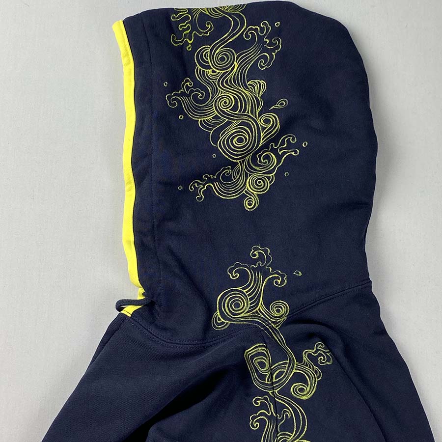 機械でのプリントの様に見えるこのとても細かな柄も全て職人が手描きで線描きした作品です。手描きならでは柄の位置にこだわり、フードから袖にかけて抽象的な荒波を流れる様に描いています。シンプルでスタイリッシュな一枚です。