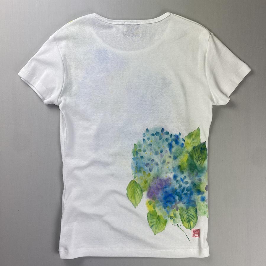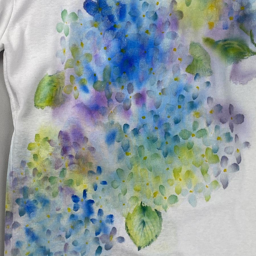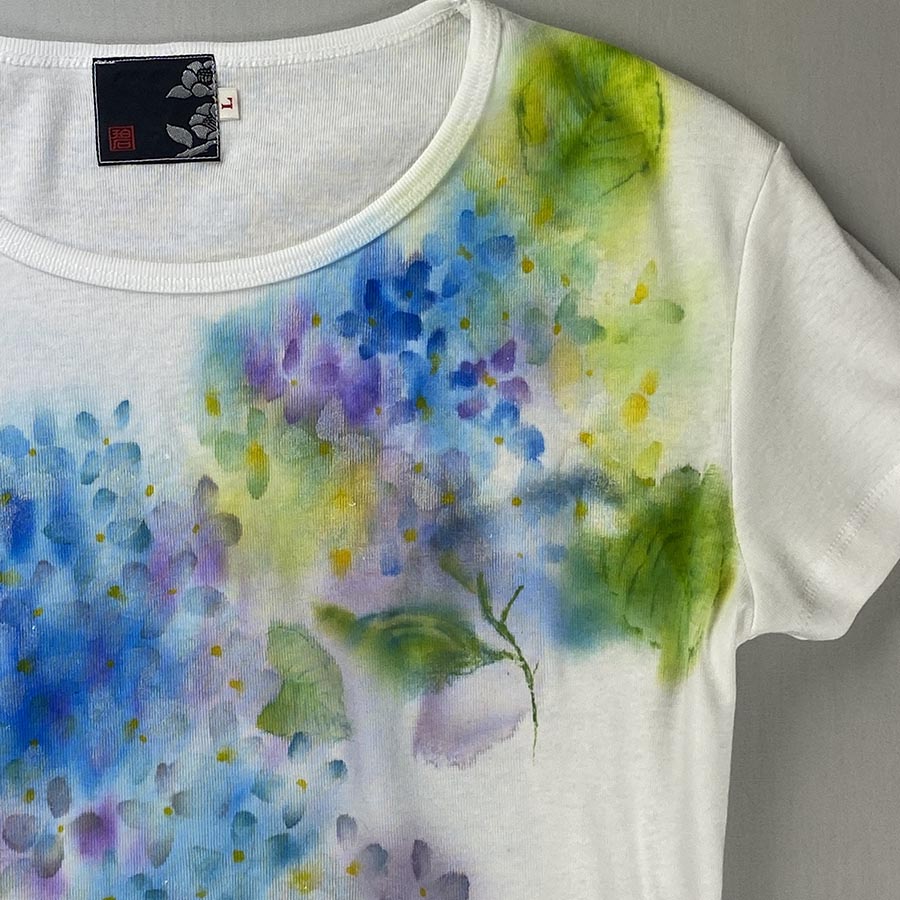 雨に濡れて咲く紫陽花を作家ならではの優しい色の滲みで表現しました。