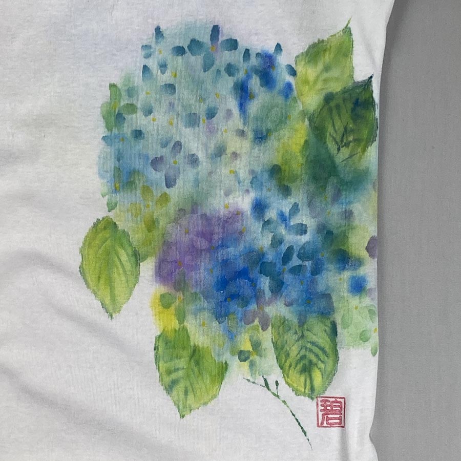 流れる様なラインで描かれたアンティークブルーの紫陽花が爽やかな一枚です。