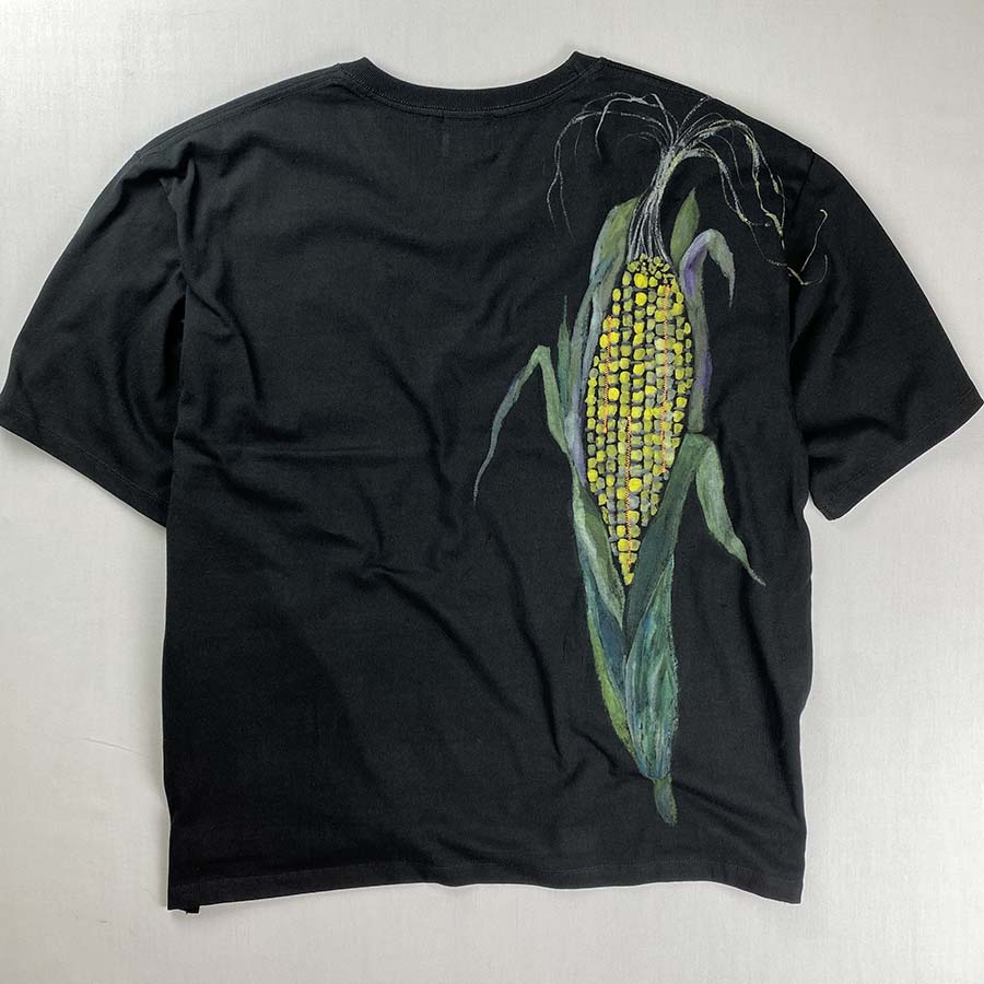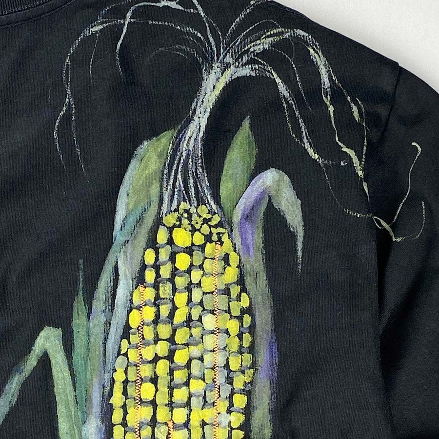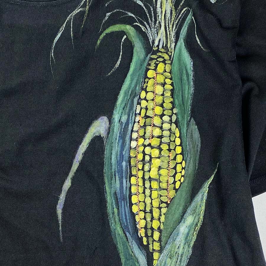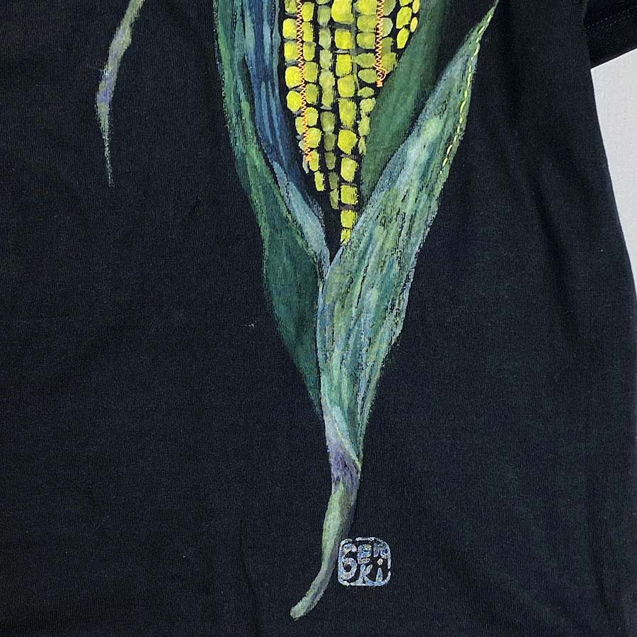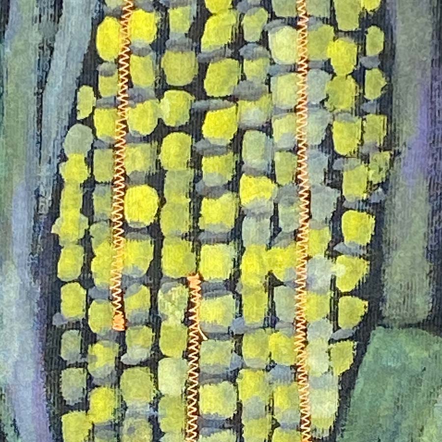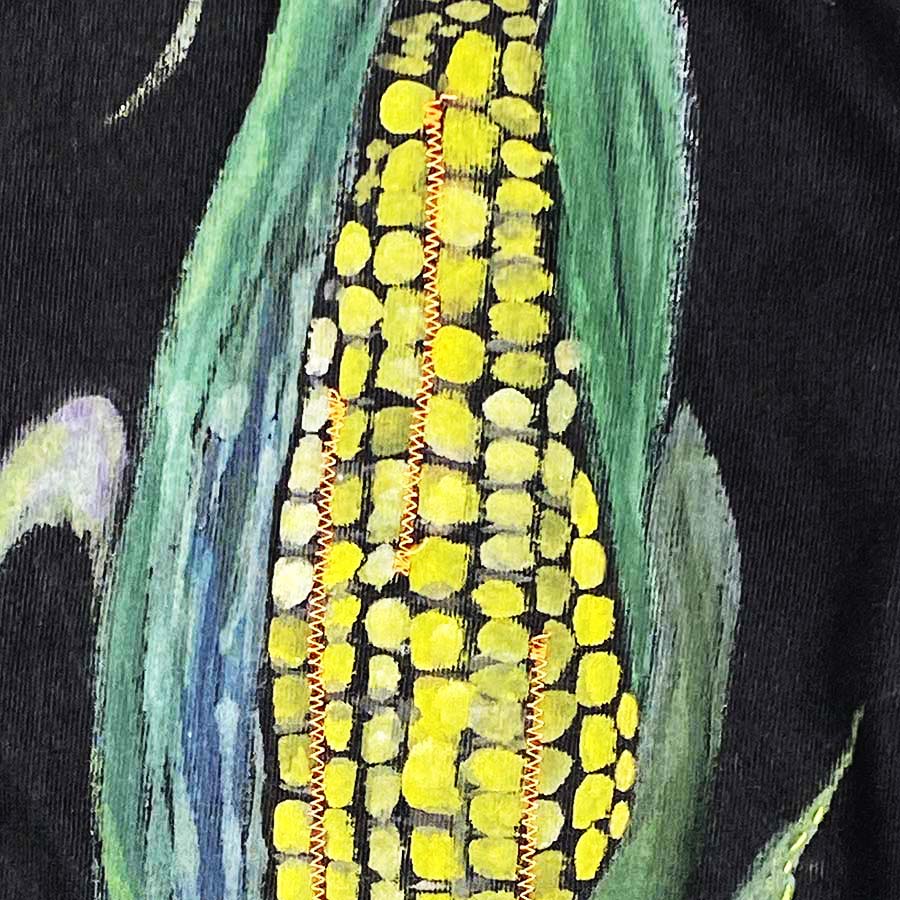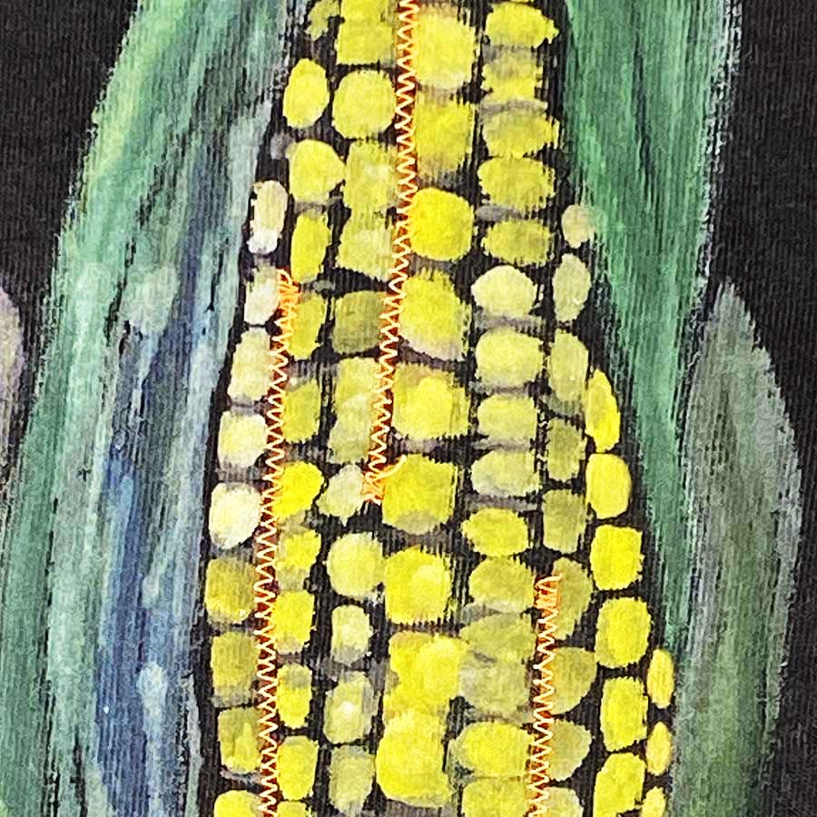 刺し子やステッチでアクセントをつけて、栄養たっぷりのトウモロコシを描きました。