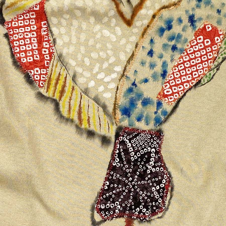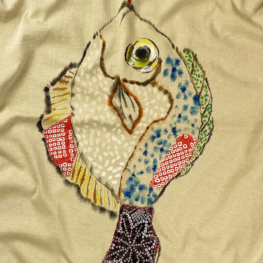 シルク生地をリメイクしたりステッチを入れたり、花柄を体に描いたり、面白い魚の柄を楽しんで頂きたいです。