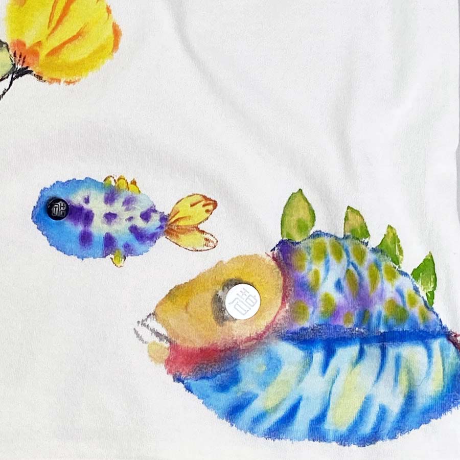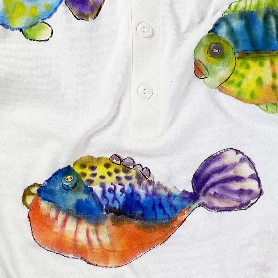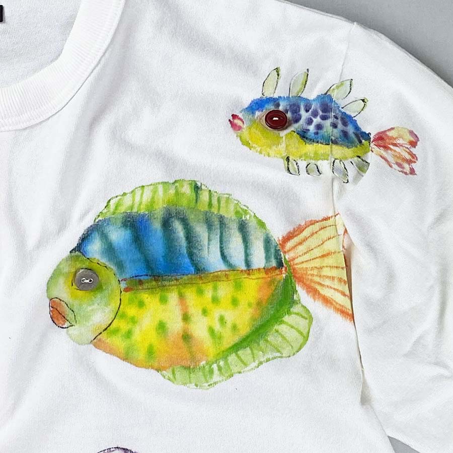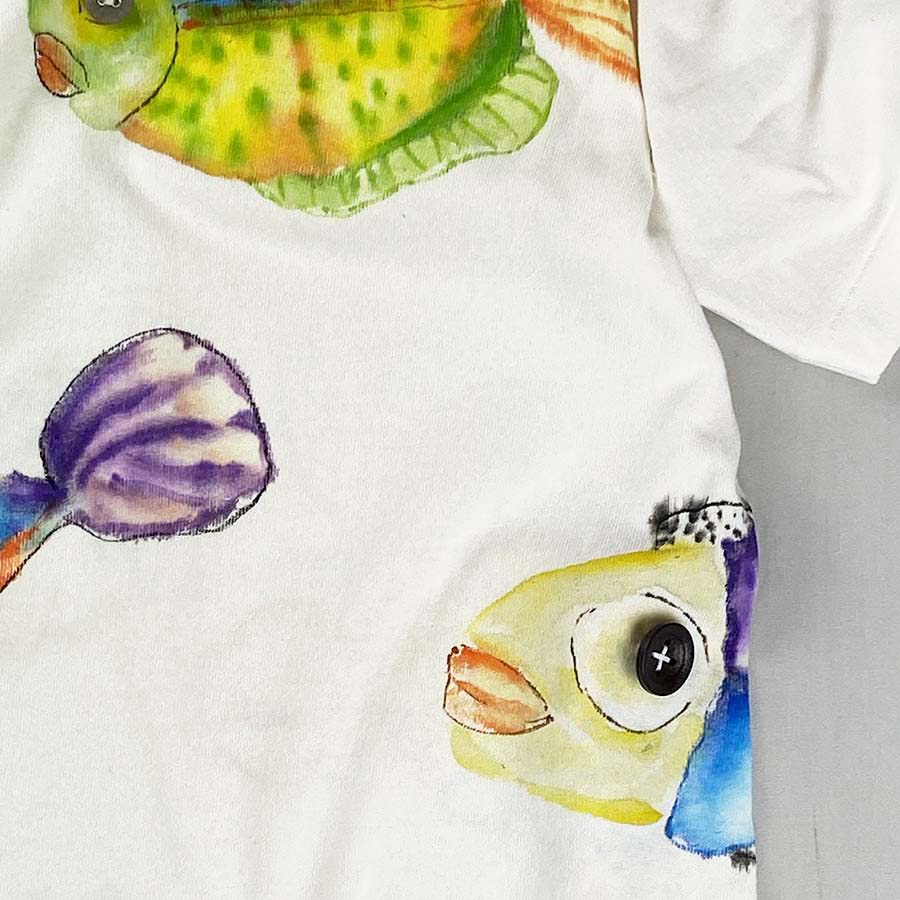 Tシャツいっぱいに、魚が沢山泳いでいますが、どの魚も変てこりんです。カラフルな色味で大小様々な魚達。