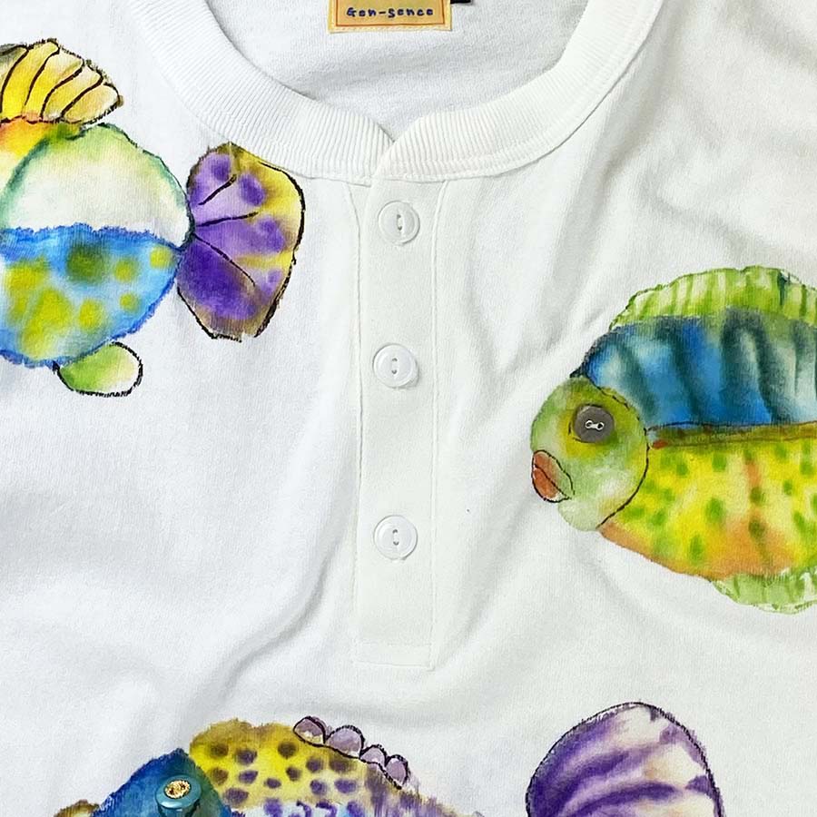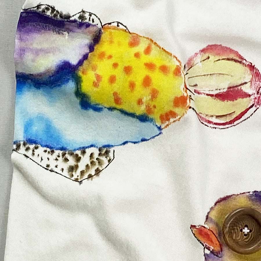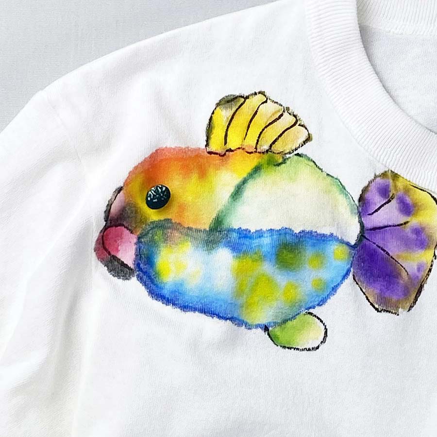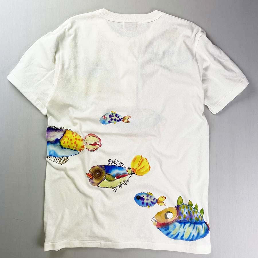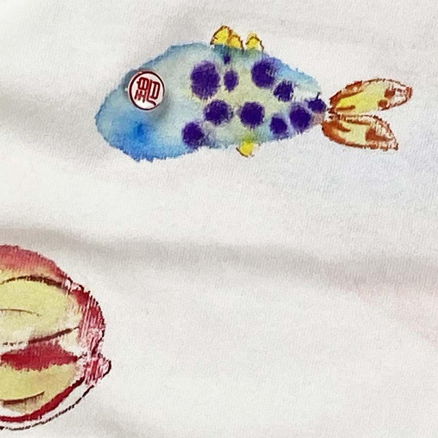 Tシャツいっぱいに、魚が沢山泳いでいますが、どの魚も変てこりんです。カラフルな色味で大小様々な魚達。