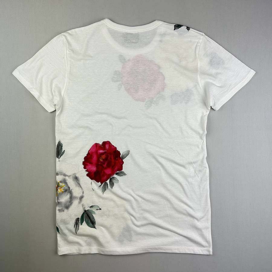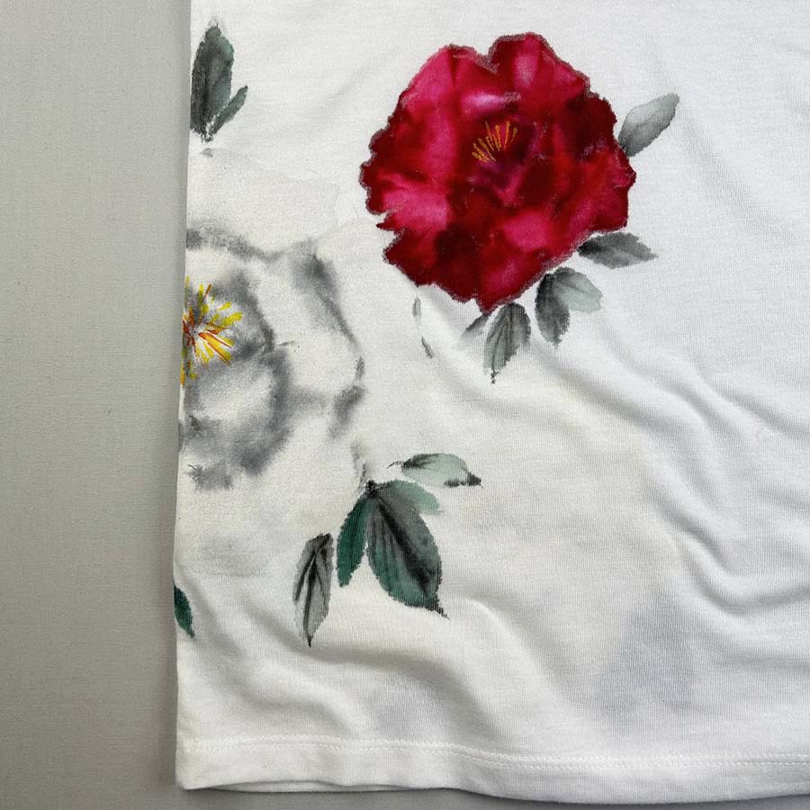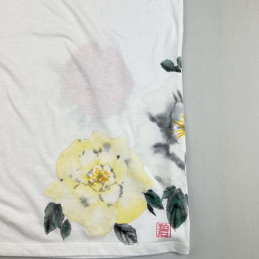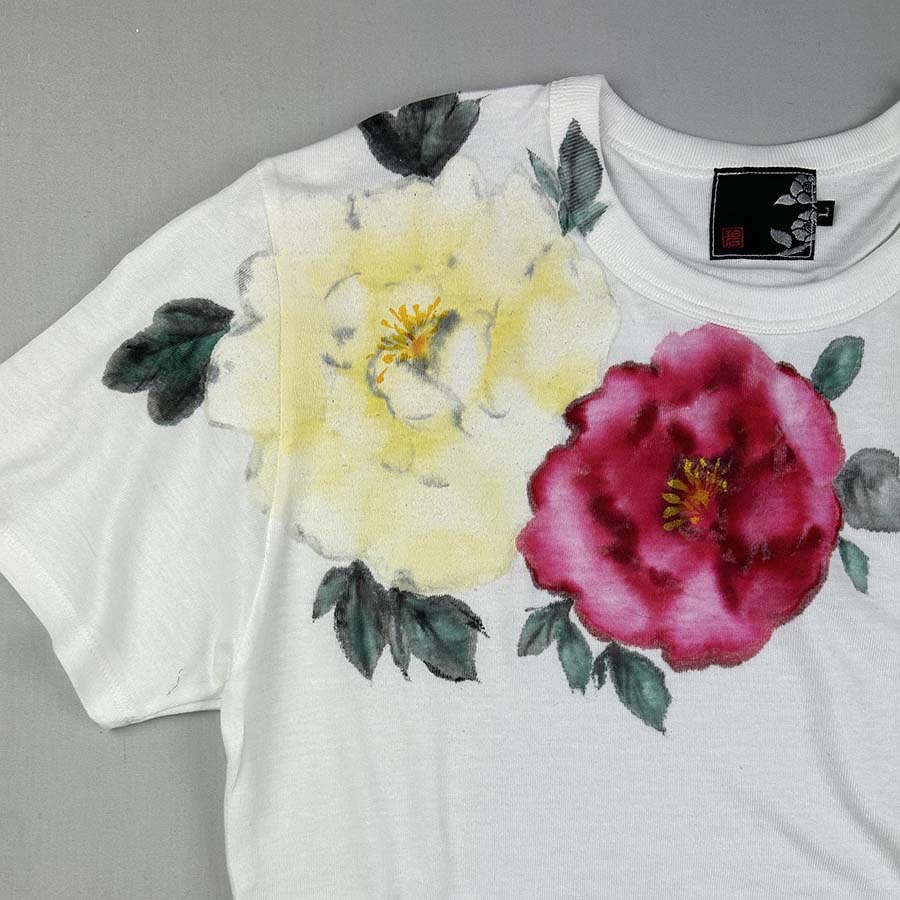 白地のTシャツには、白の牡丹の表現が味わい深く、深紅の牡丹も艶やかです。