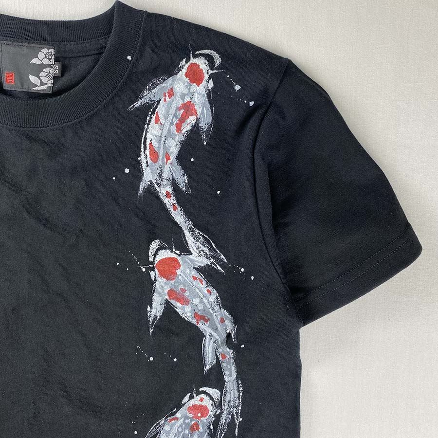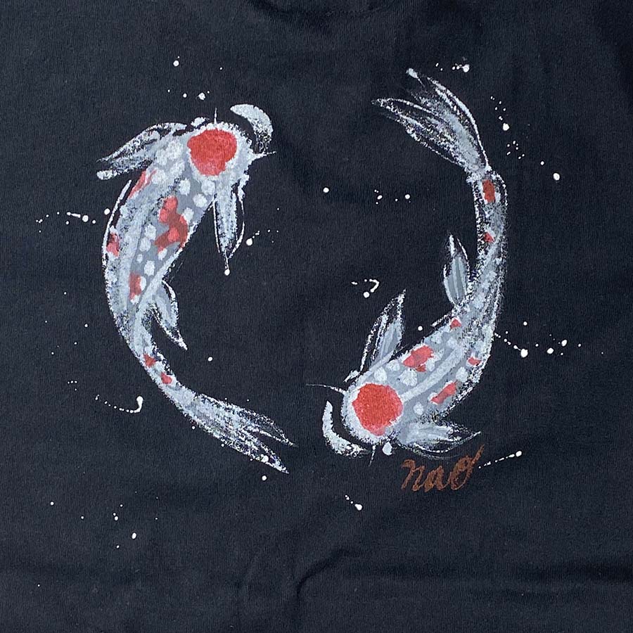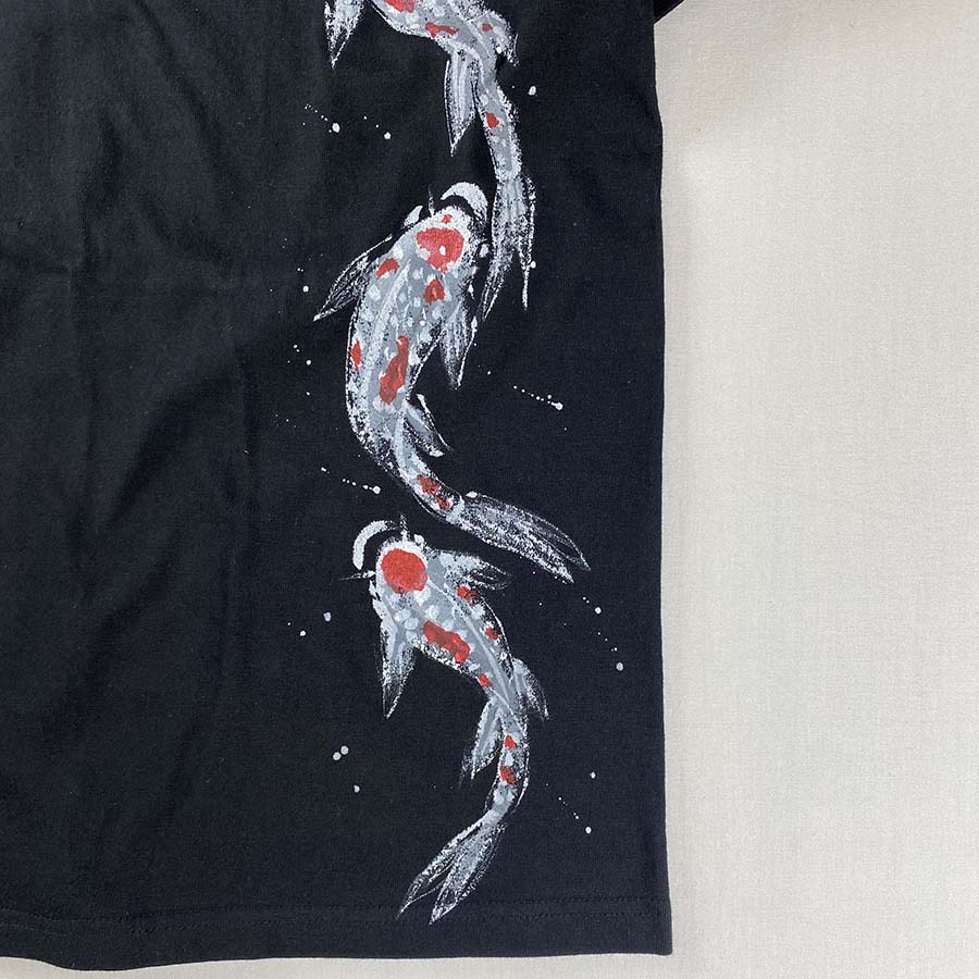 裾から上に向かって優雅に泳ぐ錦鯉達は着ているだけで縁起良く、楽しい一枚です。