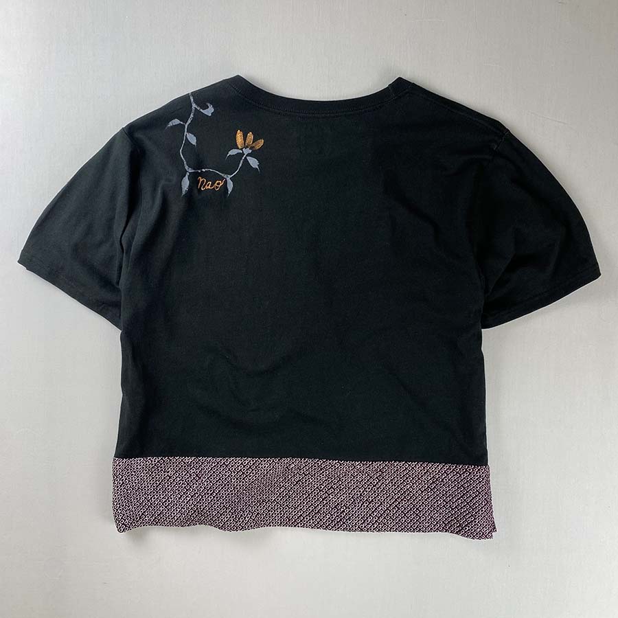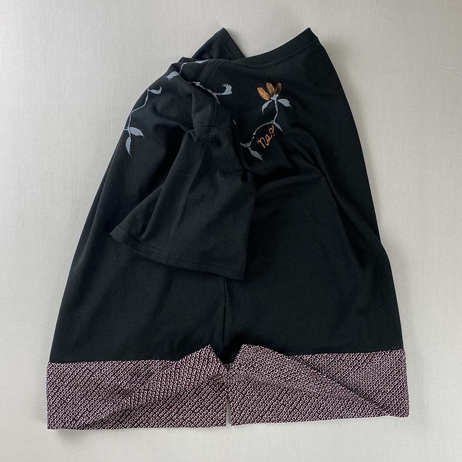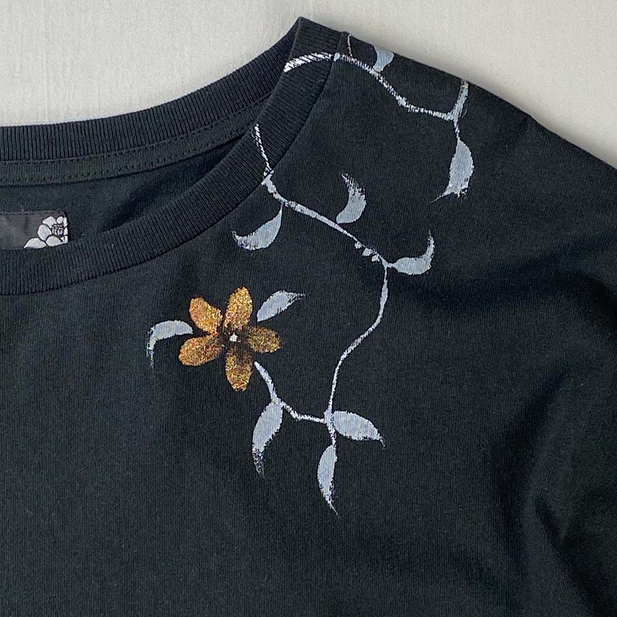 裾に疋田絞りのシルク生地をあしらい、ほんのりと朱赤に金色を混ぜて小花を描き、蔓をお顔周りに描いたシックで和の上品な雰囲気を味わっていただけるTシャツです。