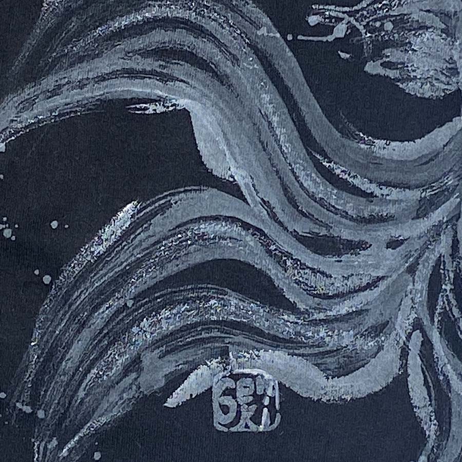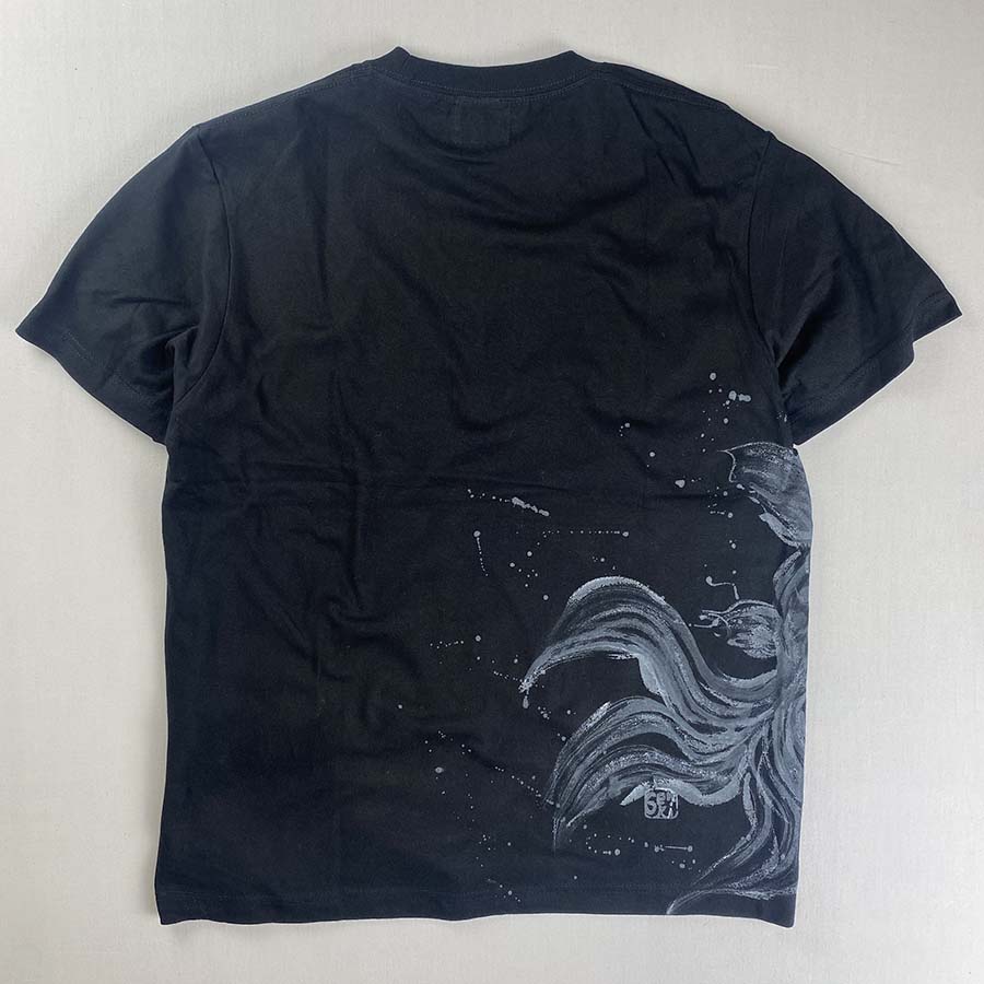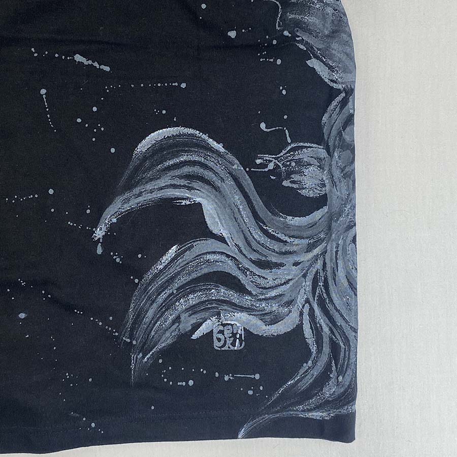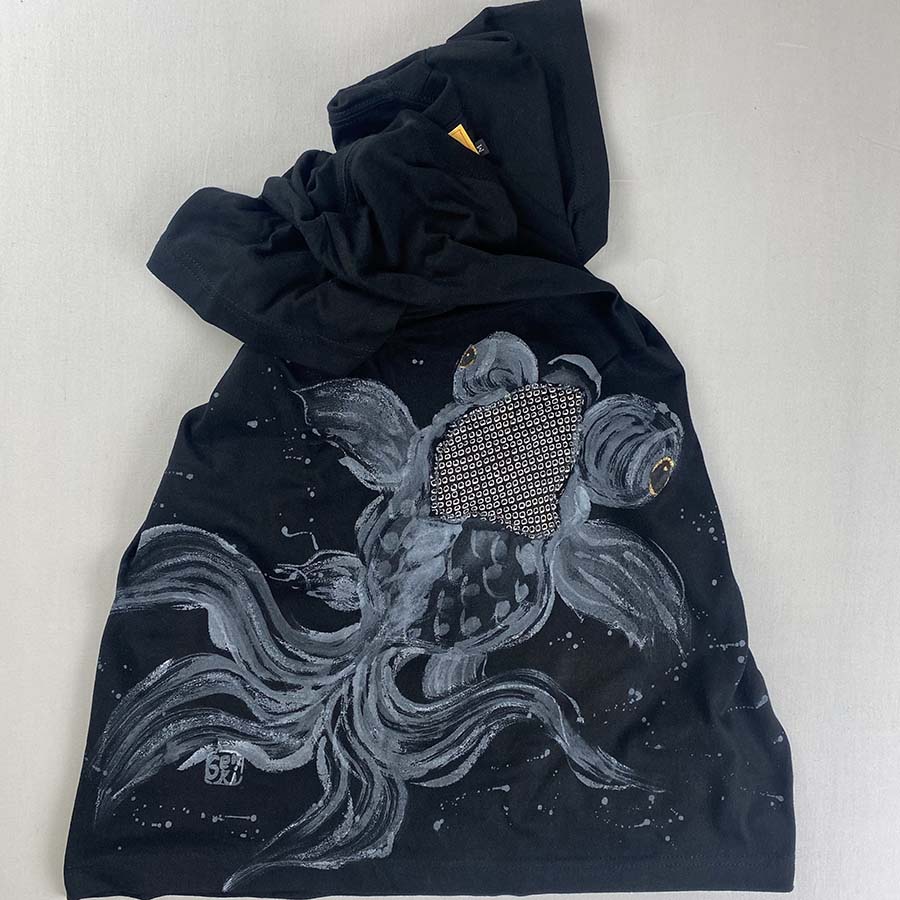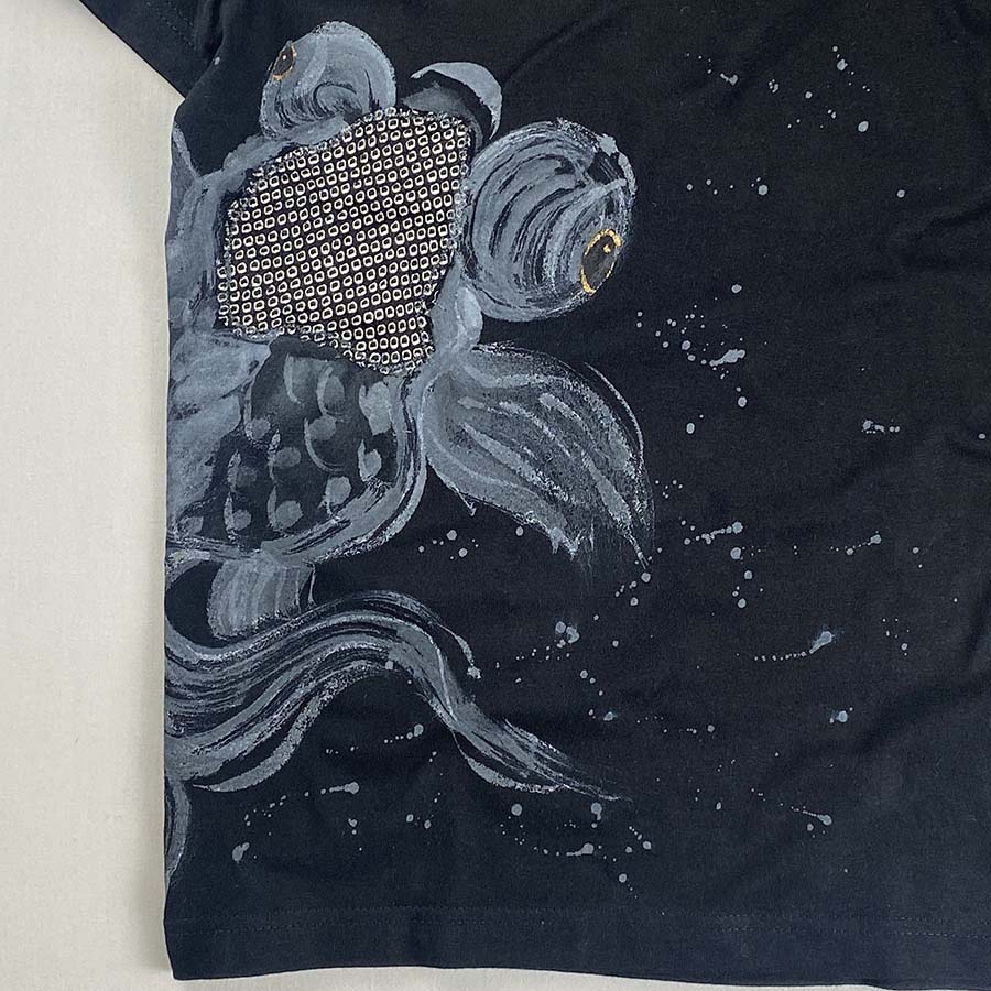 大きな出目金がひらひら泳ぐTシャツにしあがりました。ひらめきを大切に仕上げてみた楽しい一枚です。