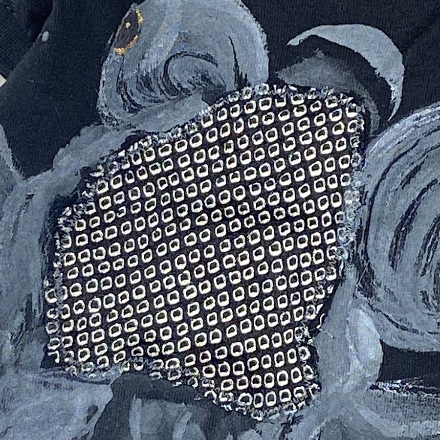 作家が京鹿の子絞り生地をTシャツに縫い付けてから柄を考えました。