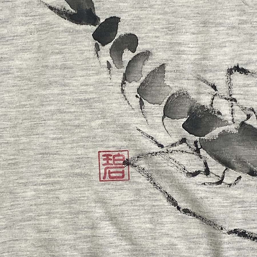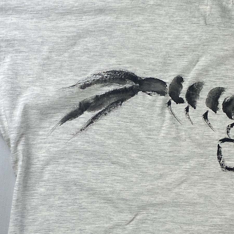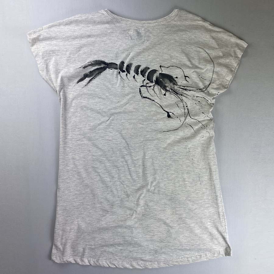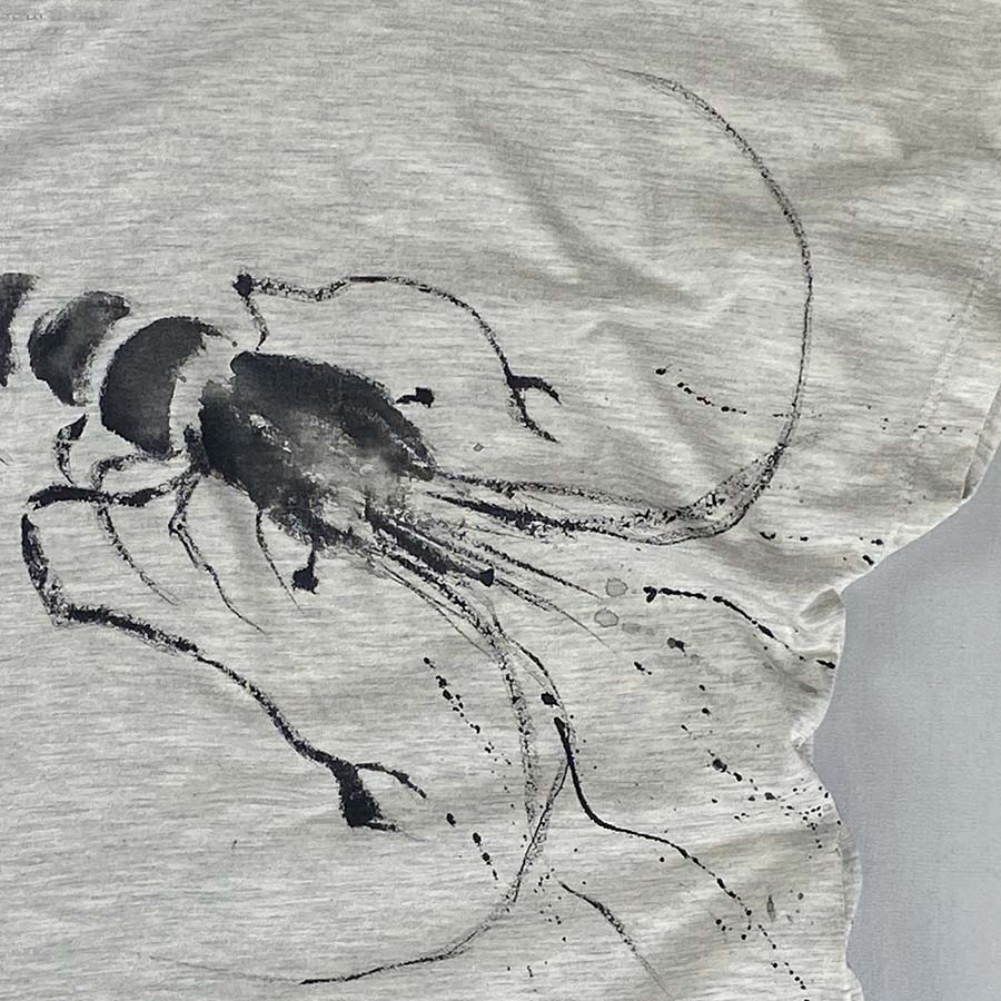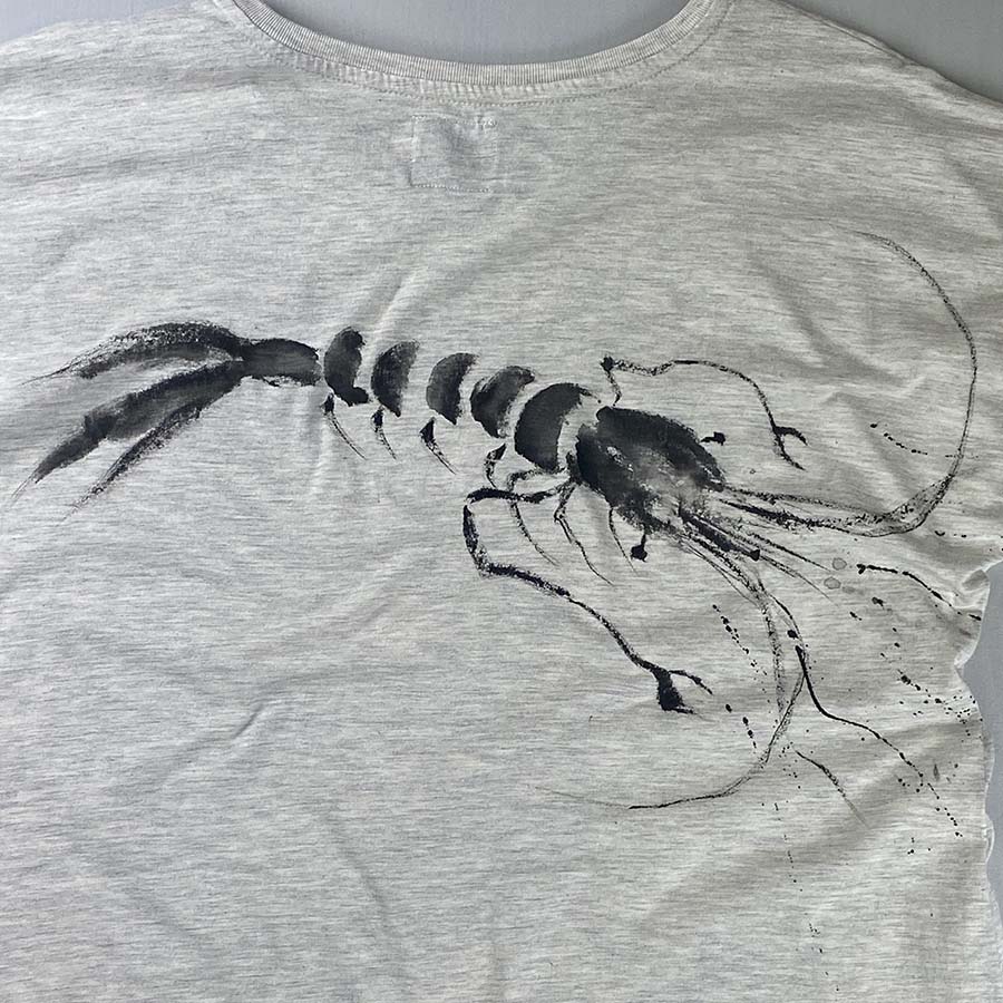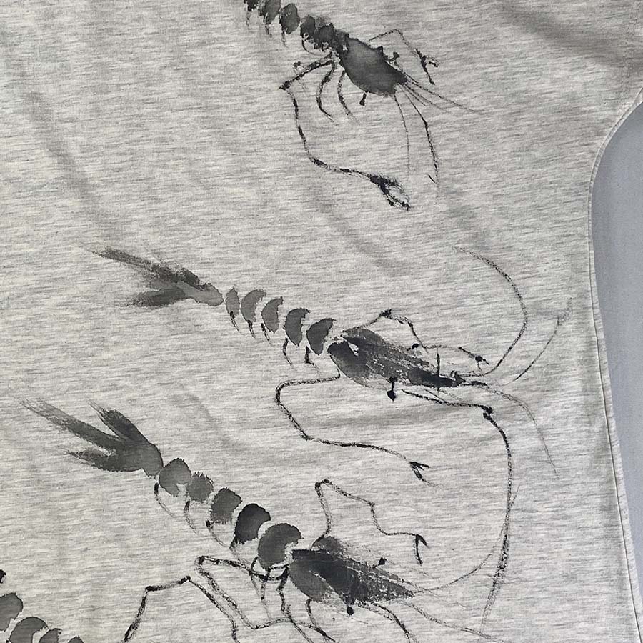 厳しい暑さを忘れる賀茂川のせせらぎに、手長海老が楽しそうに涼をとっている様子をドルマンワンピースに墨濃淡でえがきました。