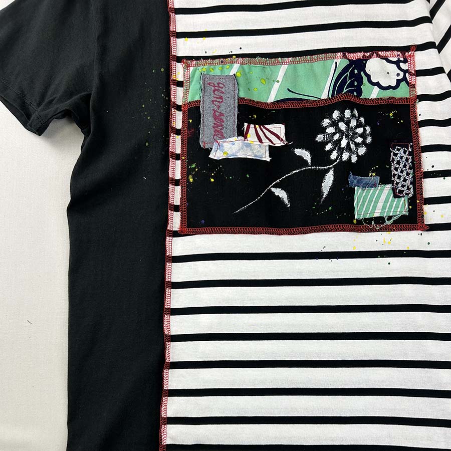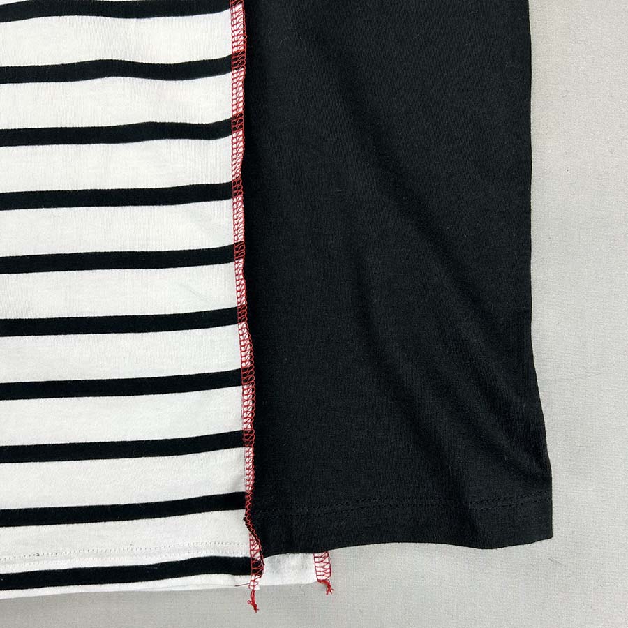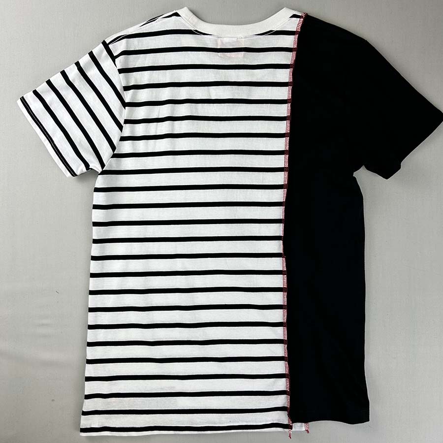 ボーダーと無地、2つのTシャツを大胆にも裁断し、ドッキングさせた面白いTシャツです。