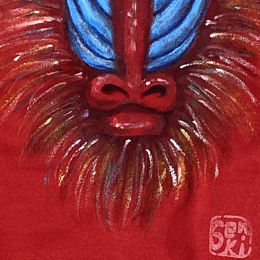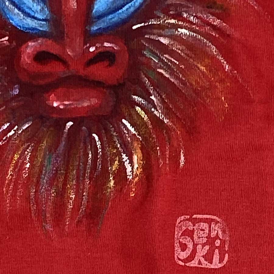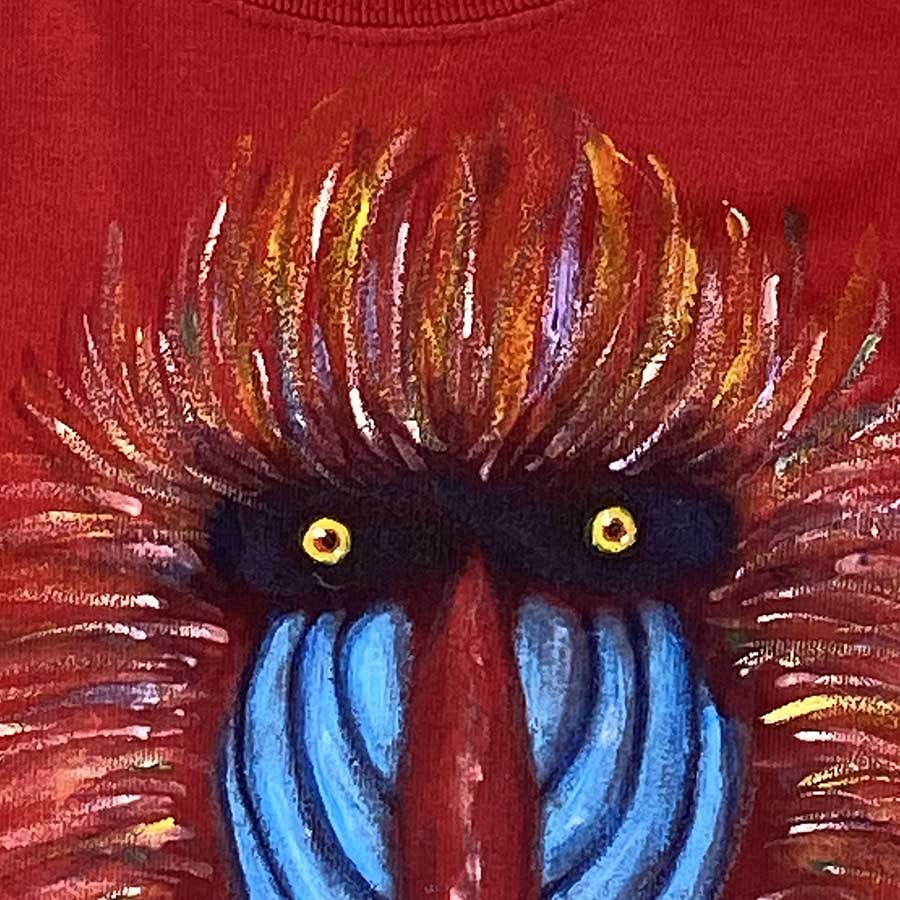 その感動を直ぐに表現したくて、カラフルで鮮やかなその姿を、赤色のTシャツに描きました。