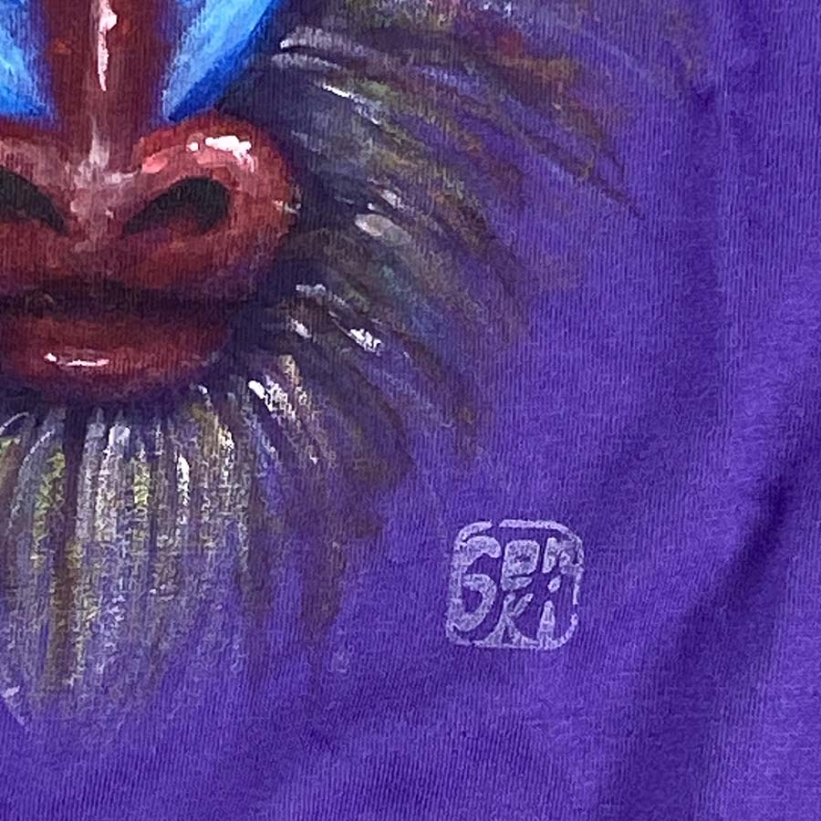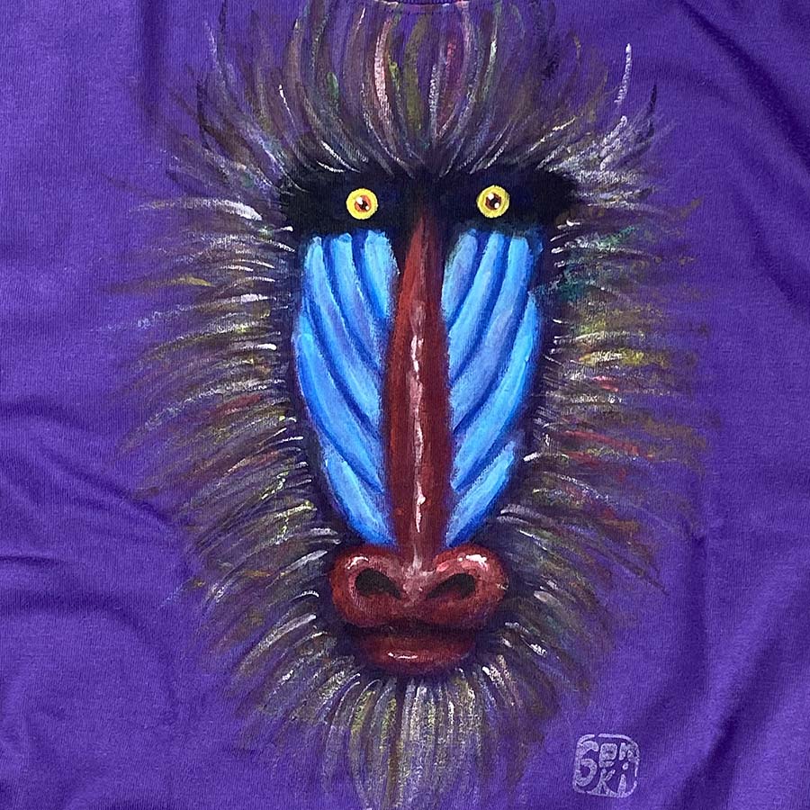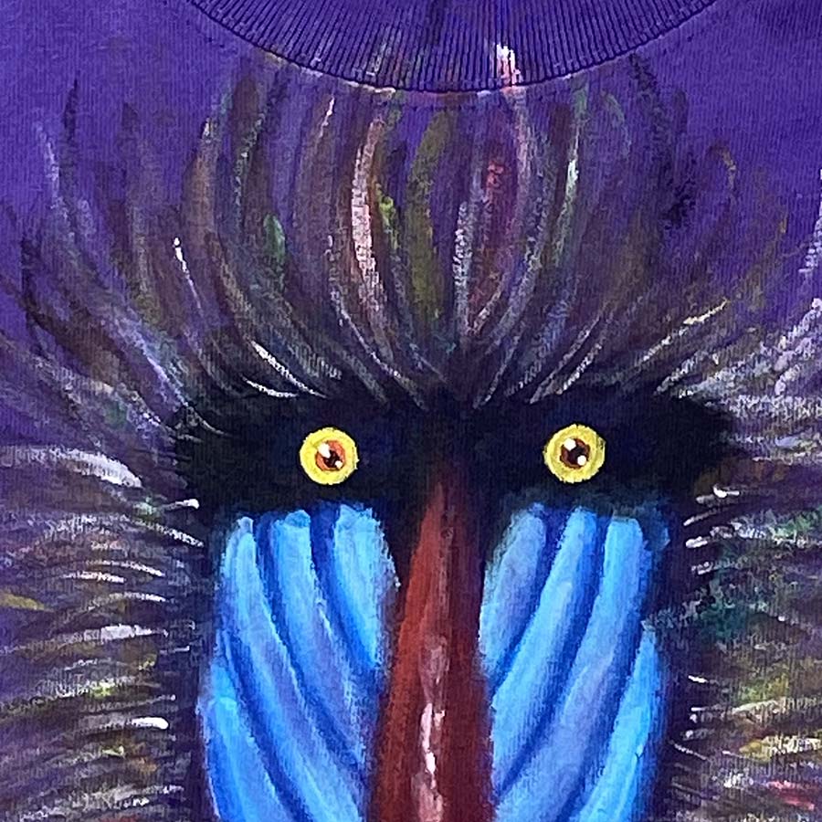その感動を直ぐに表現したくて、カラフルで鮮やかなその姿を、紫色のTシャツに描きました。