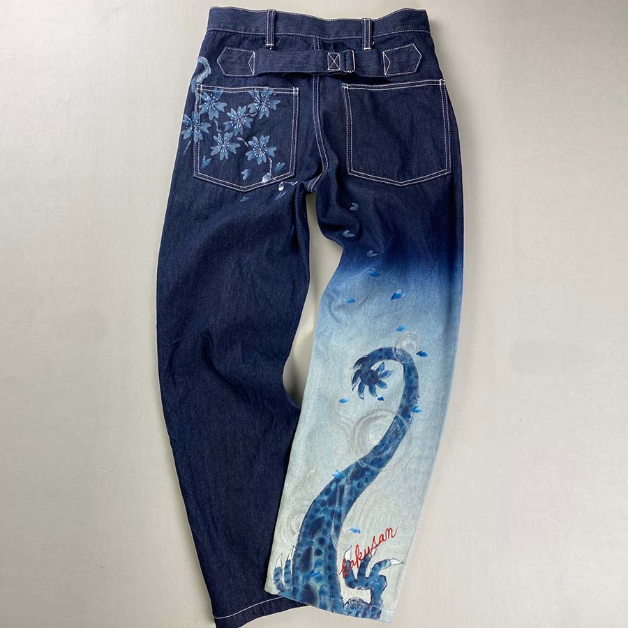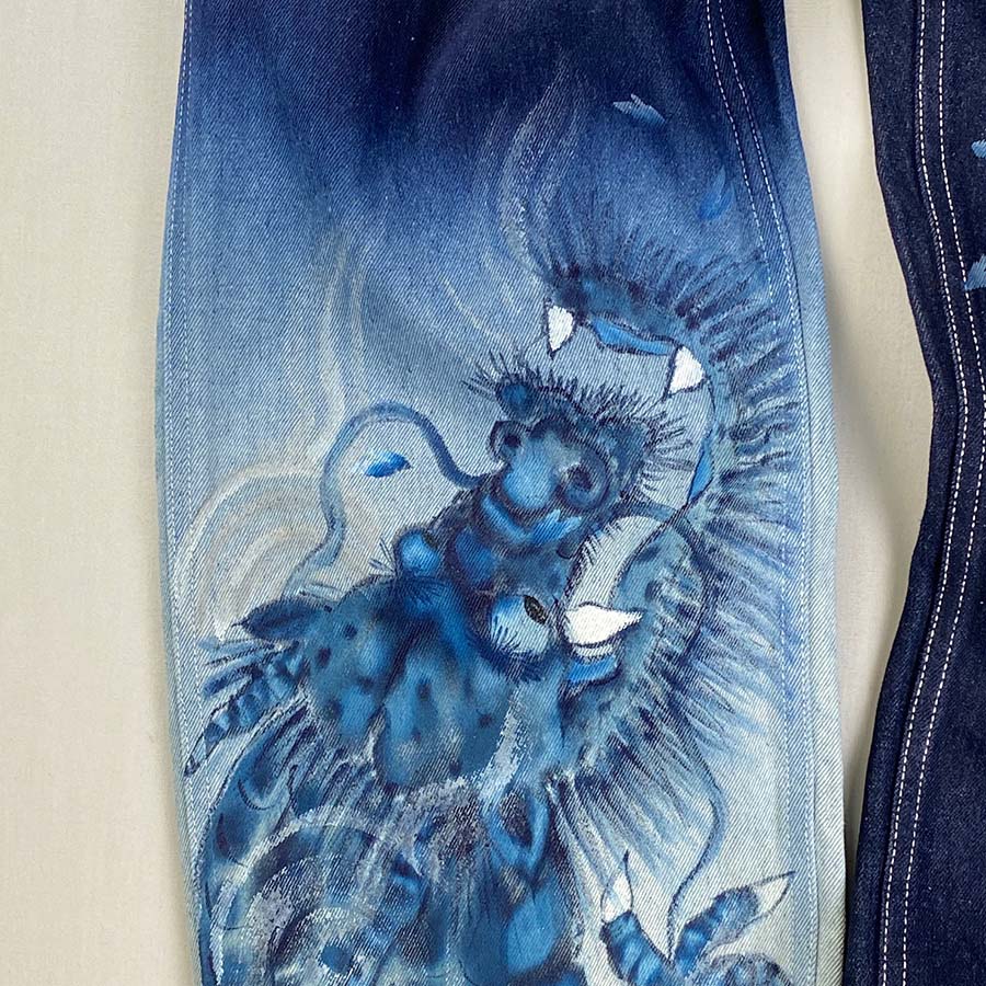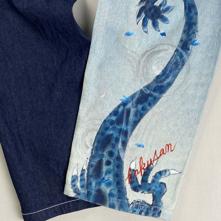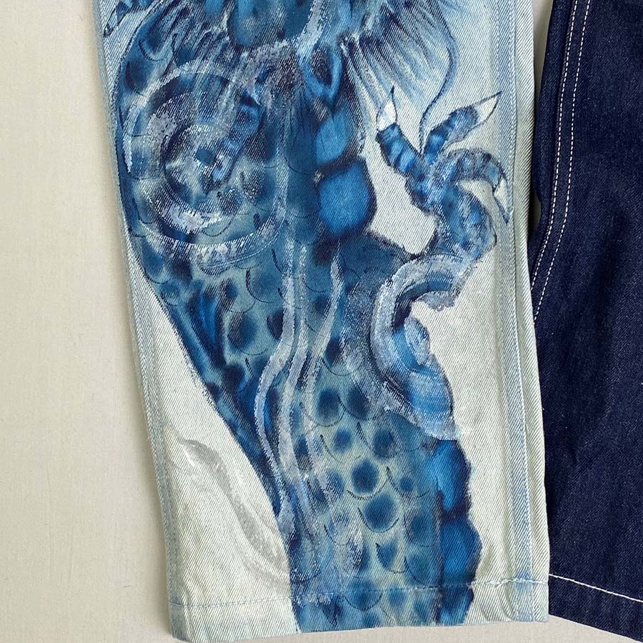 バックストラップの付いたパッチポケットタイプのデニムパンツに青い龍を描きました。