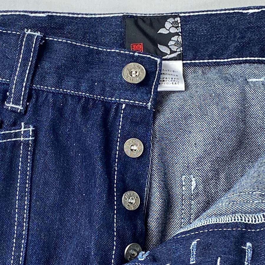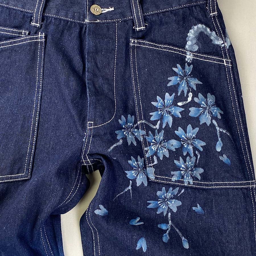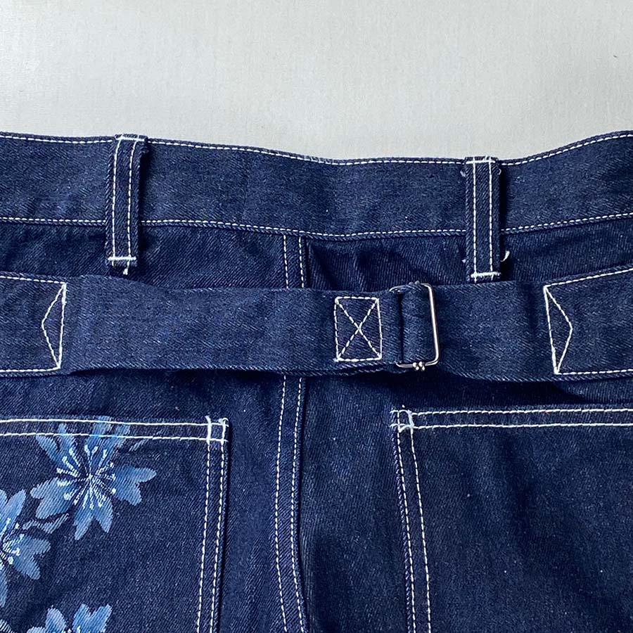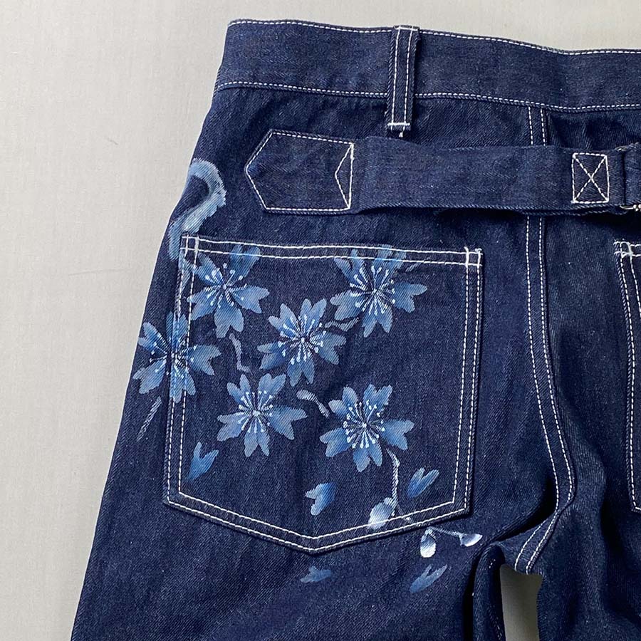 バックストラップの付いたパッチポケットタイプのデニムパンツに青い龍を描きました。