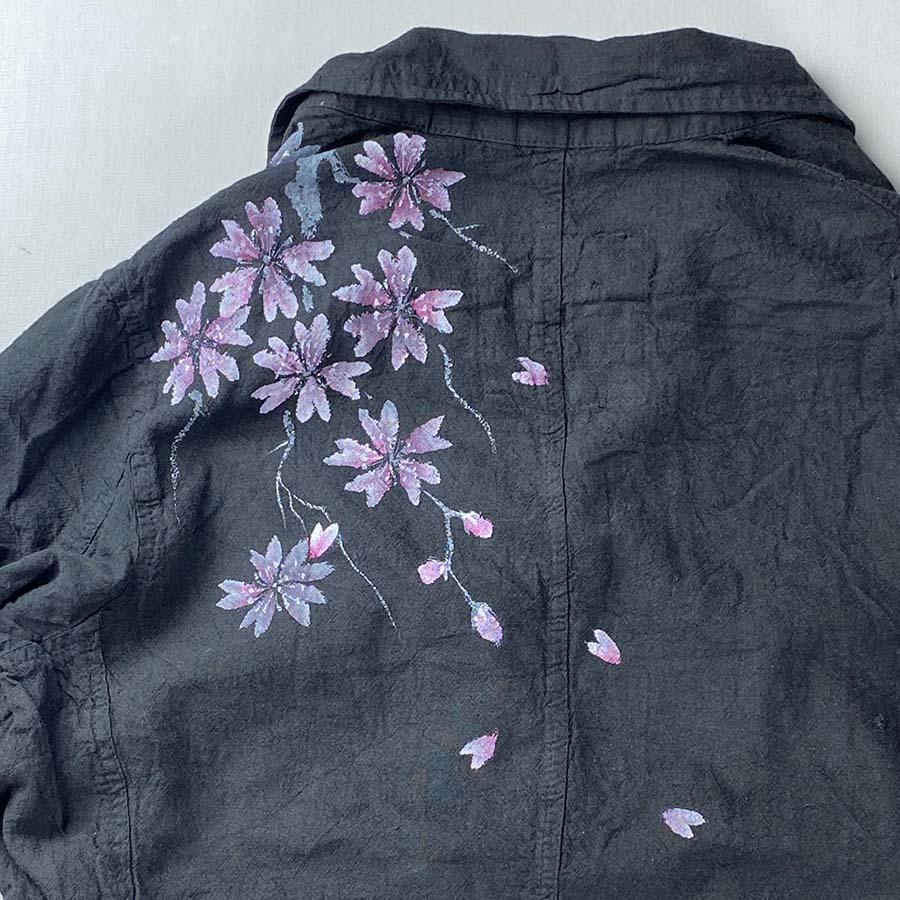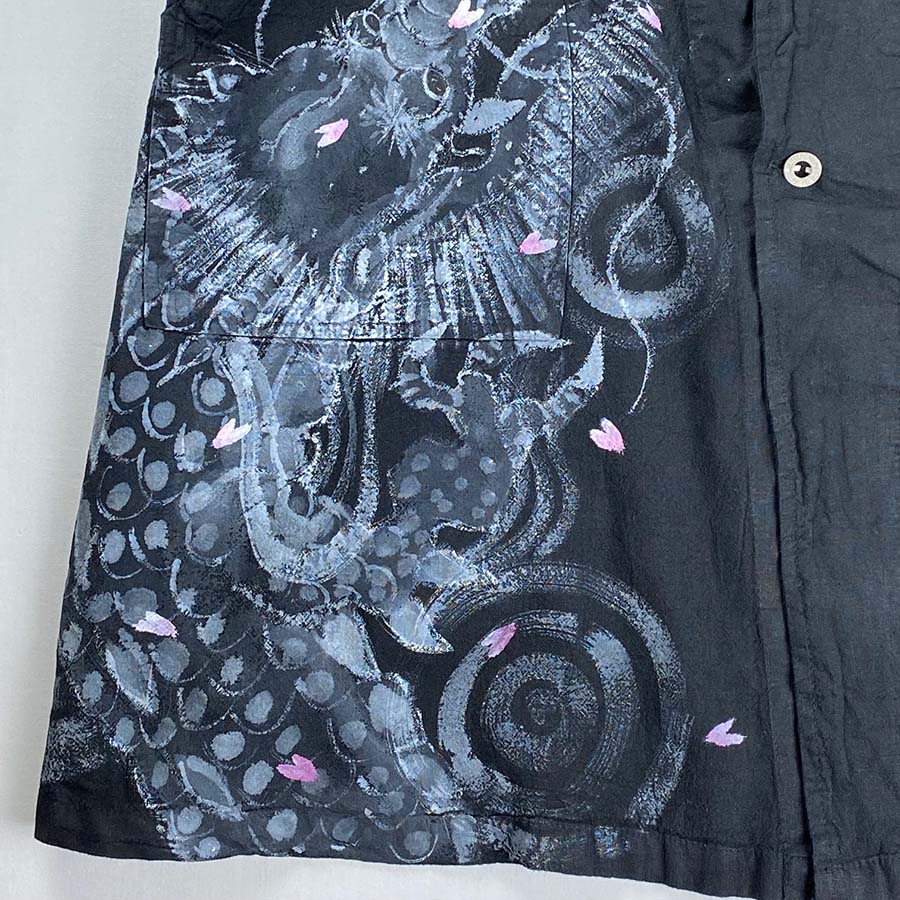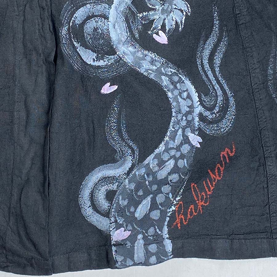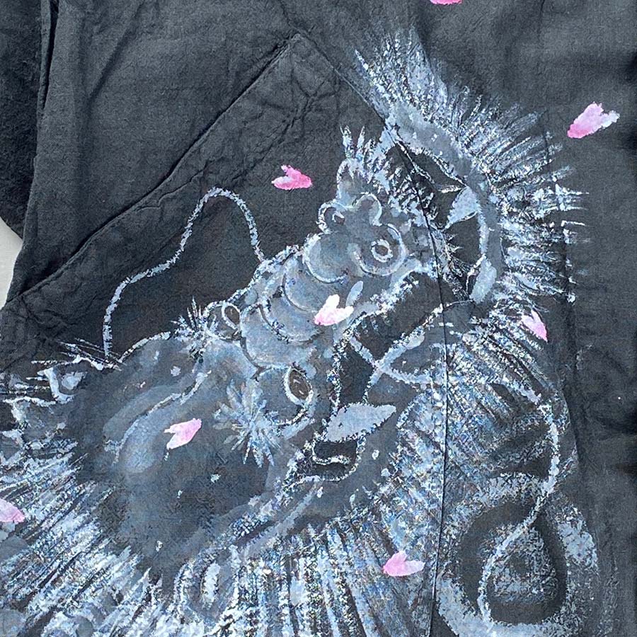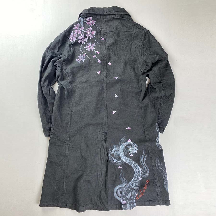 大きなポケットと後ろの長めに開いたスリット、タック釦がついたカジュアルなコート。洗いざらしでサラッと羽織って頂ける一品です。 そのコートに桜と龍。龍がお花見しています。