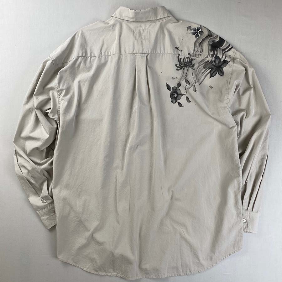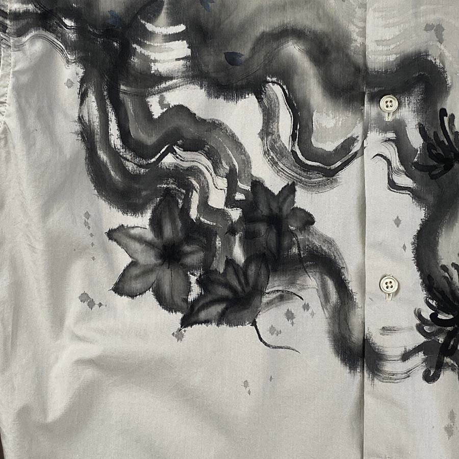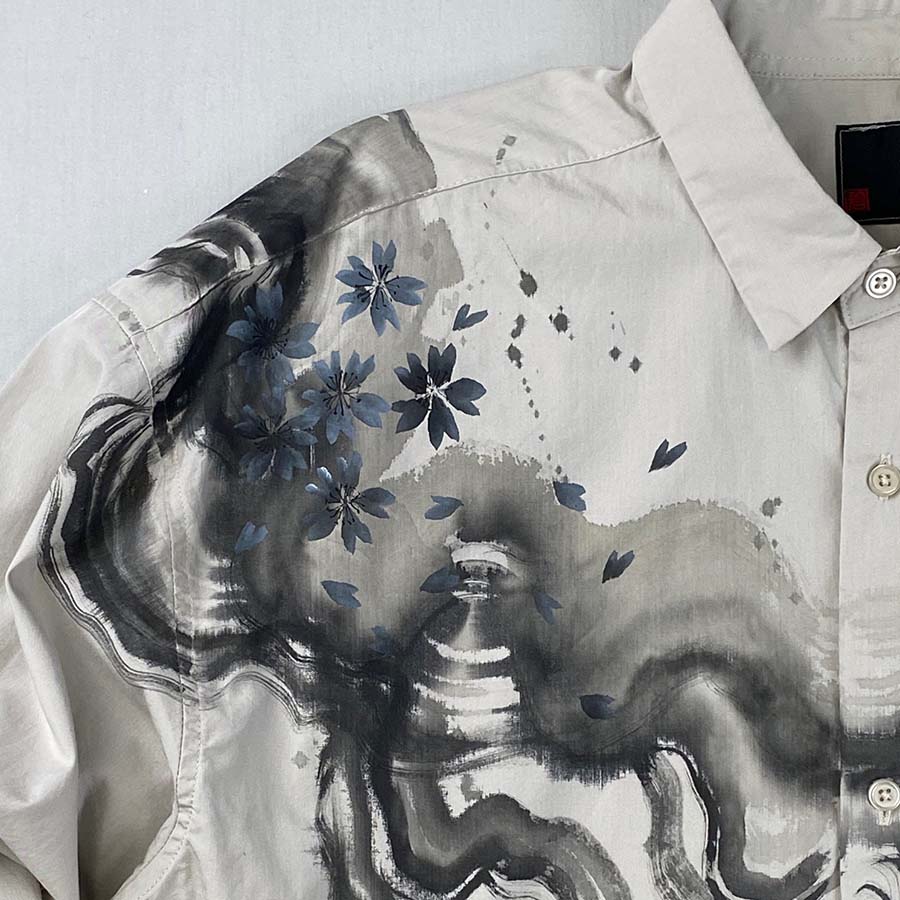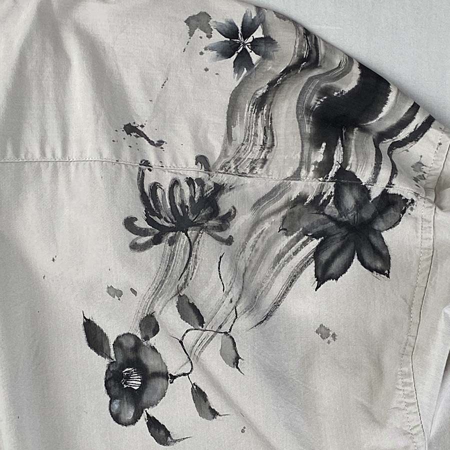 風に吹かれながら日本の四季の花が揺れ動きます。桜〜桔梗〜乱菊〜椿と真っ白なシャツに墨が映える豪華な一枚。