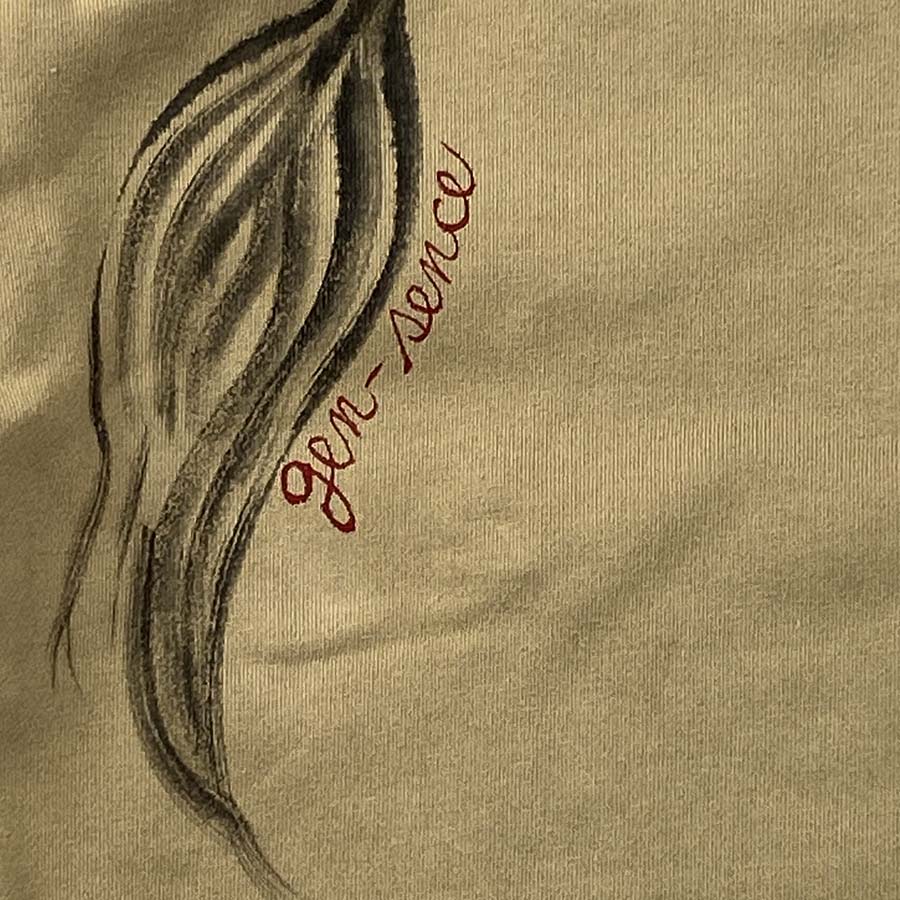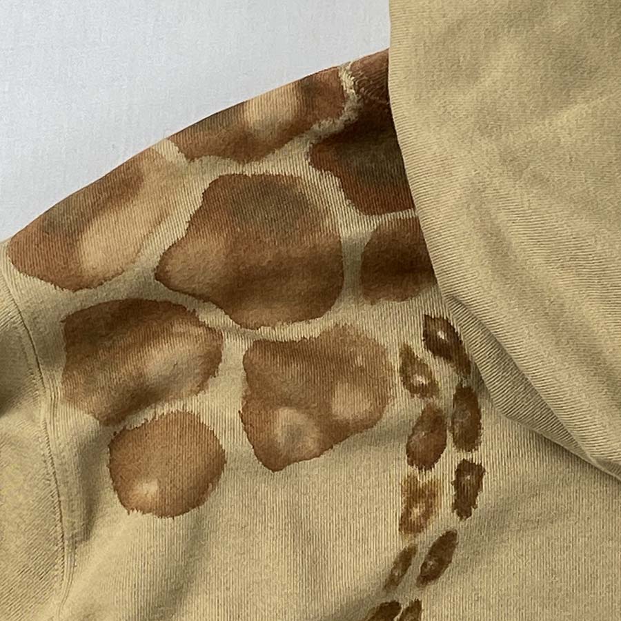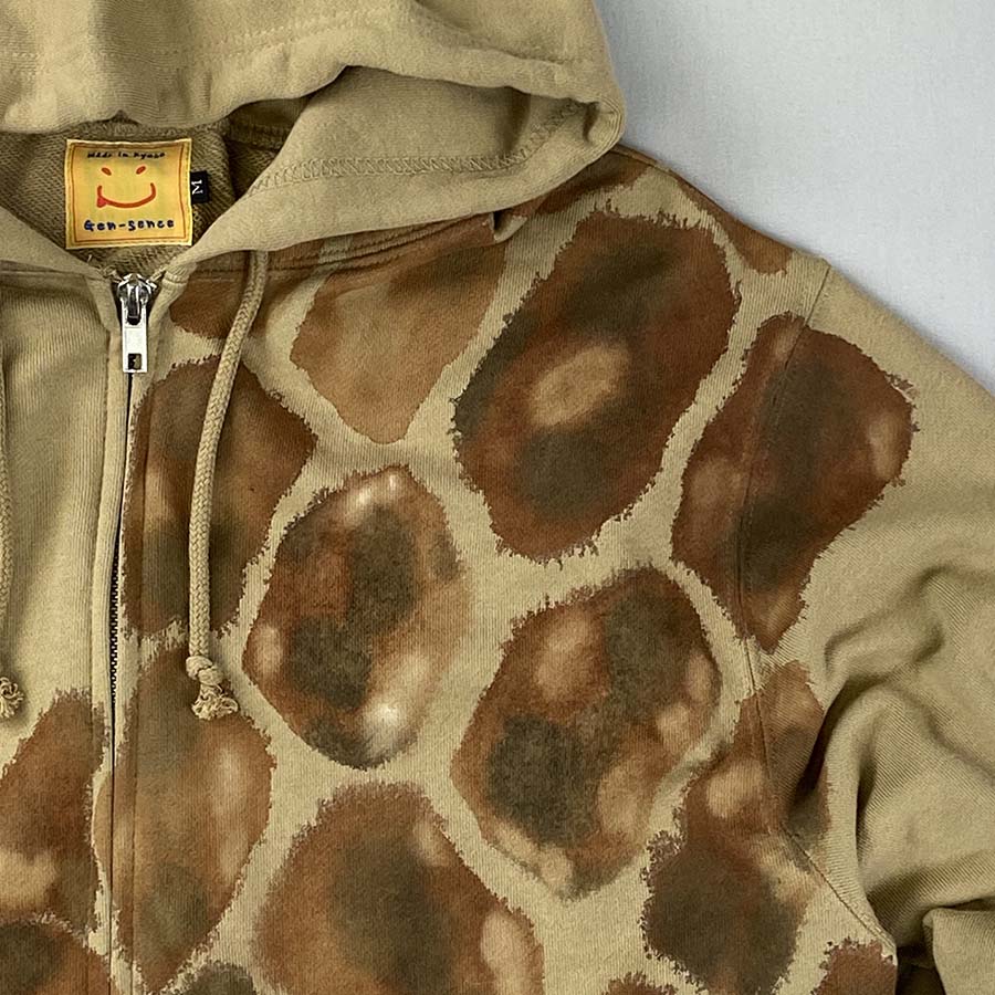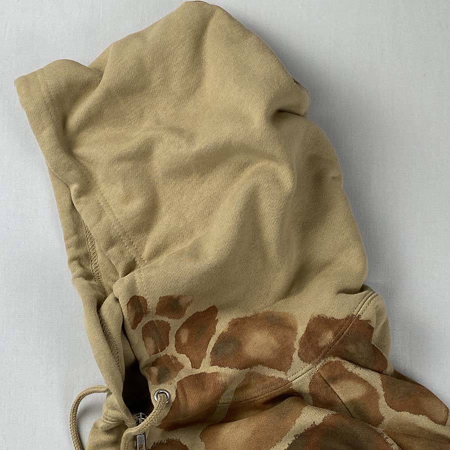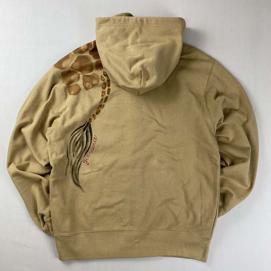 麒麟の斑模様をパーカーに描き抽象的に表現しました。肩から麒麟の尾っぽが出ている後ろ姿は何とも面白いバックショット