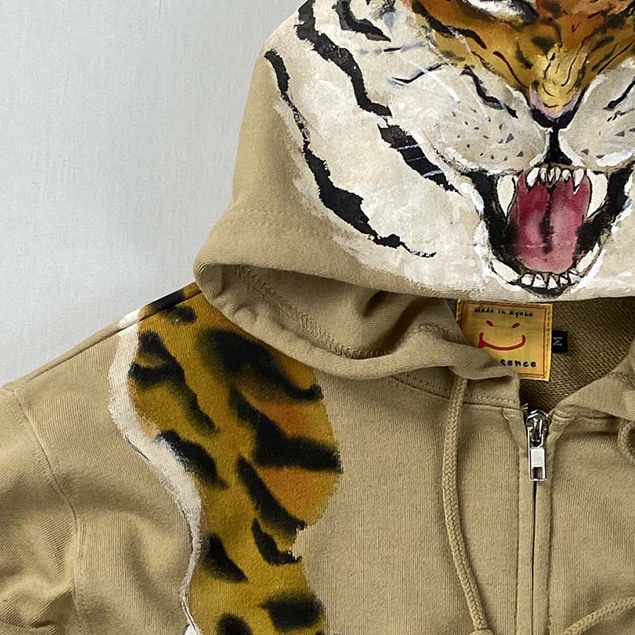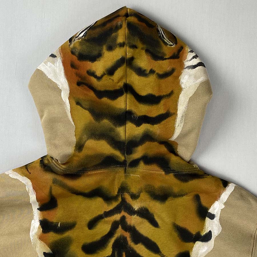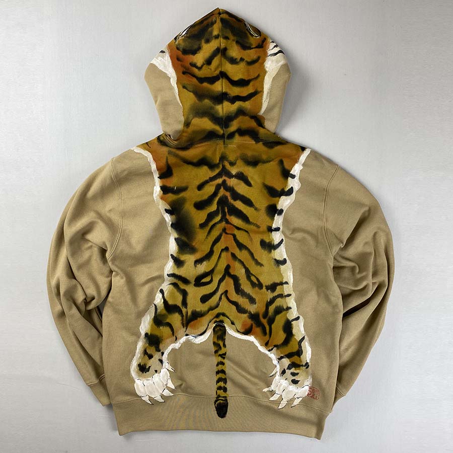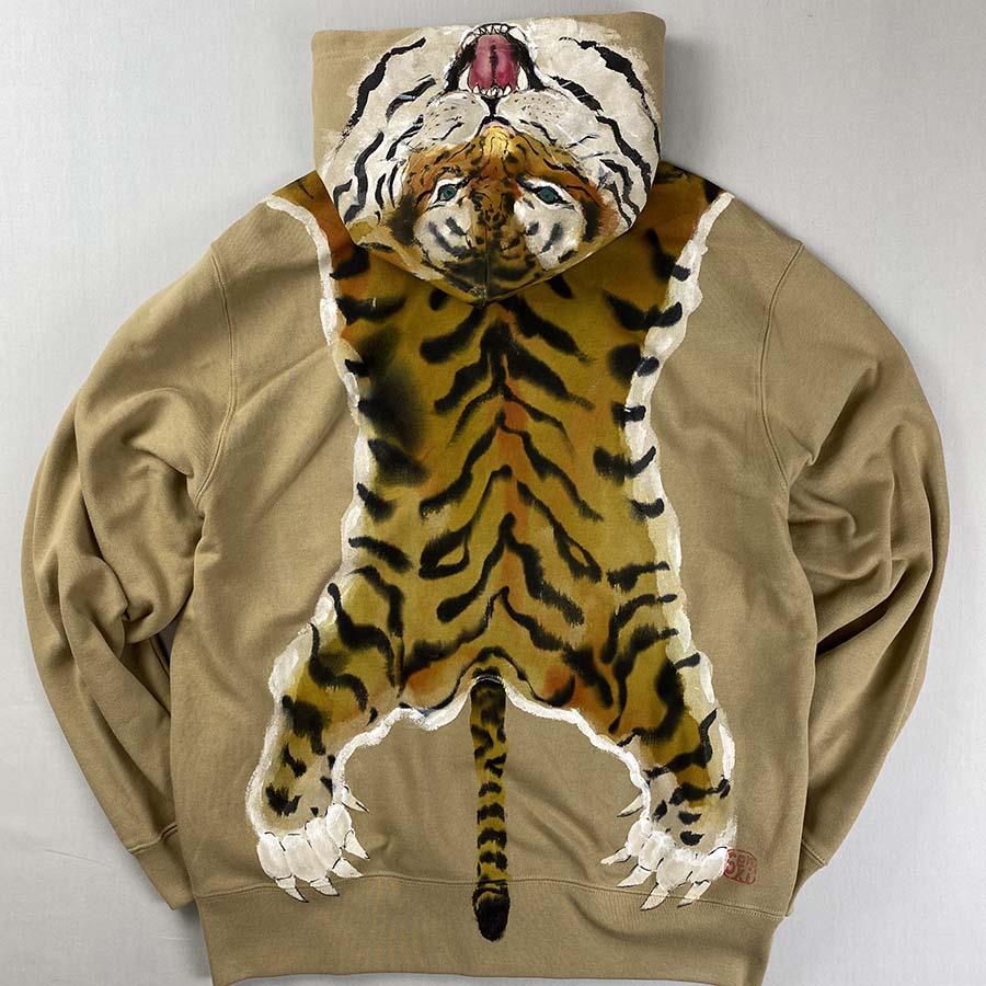フード部分には顔、後ろ身全体に虎の背中が描かれ、虎を背負っている様な最高に面白い一品が出来上がりました。