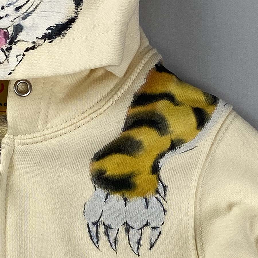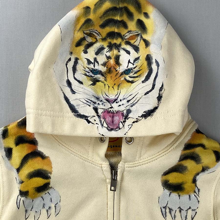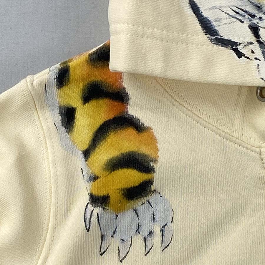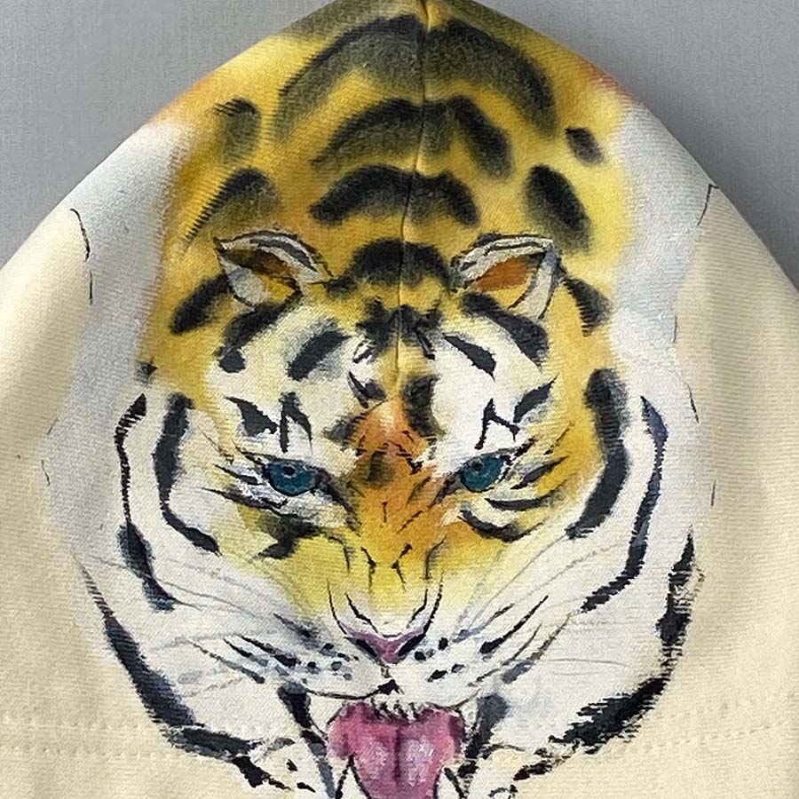 フード部分には顔、後ろ身全体に虎の背中が描かれ、虎を背負っている様な最高に面白い一品が出来上がりました。