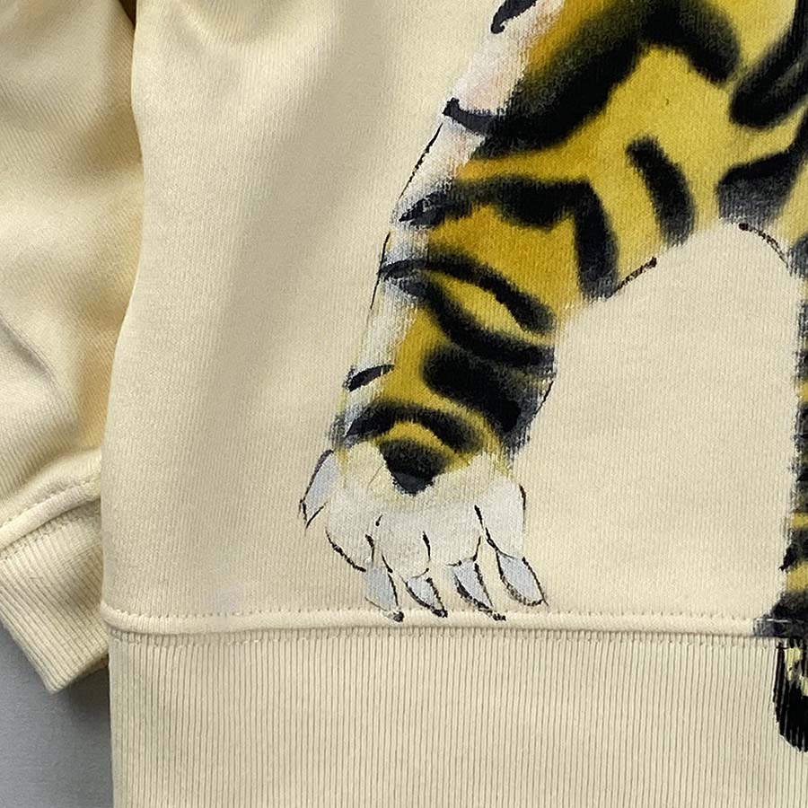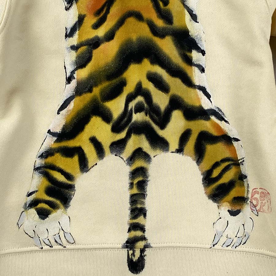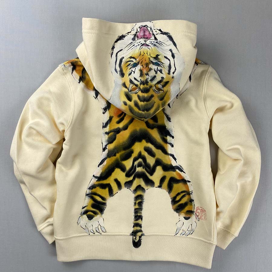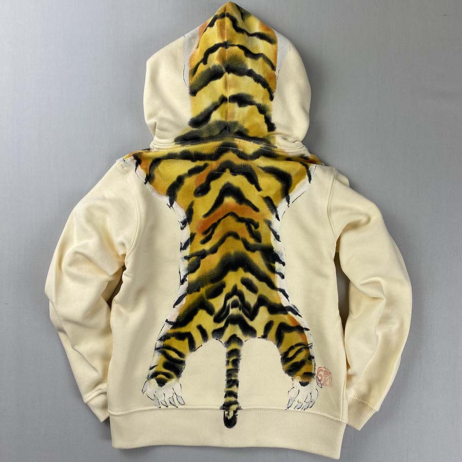 フード部分には顔、後ろ身全体に虎の背中が描かれ、虎を背負っている様な最高に面白い一品が出来上がりました。