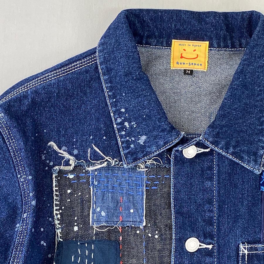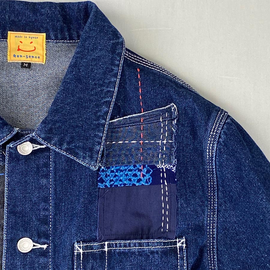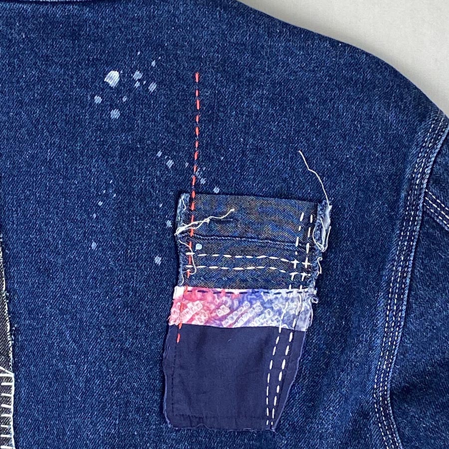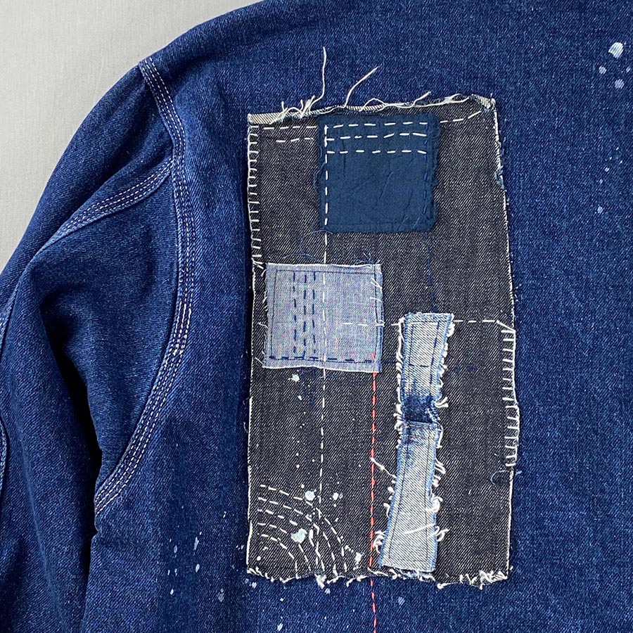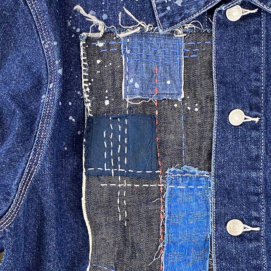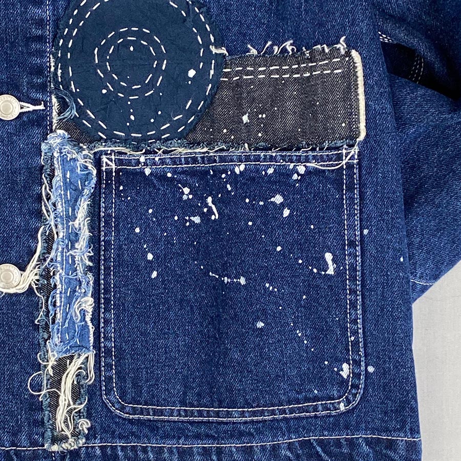 様々な布をリメイクして赤や白糸で手刺し子し、白いしぶきも散りばめたとても楽しいジャケットが出来ました。一枚、一枚リメイクの仕方が違うので正に一点もの。